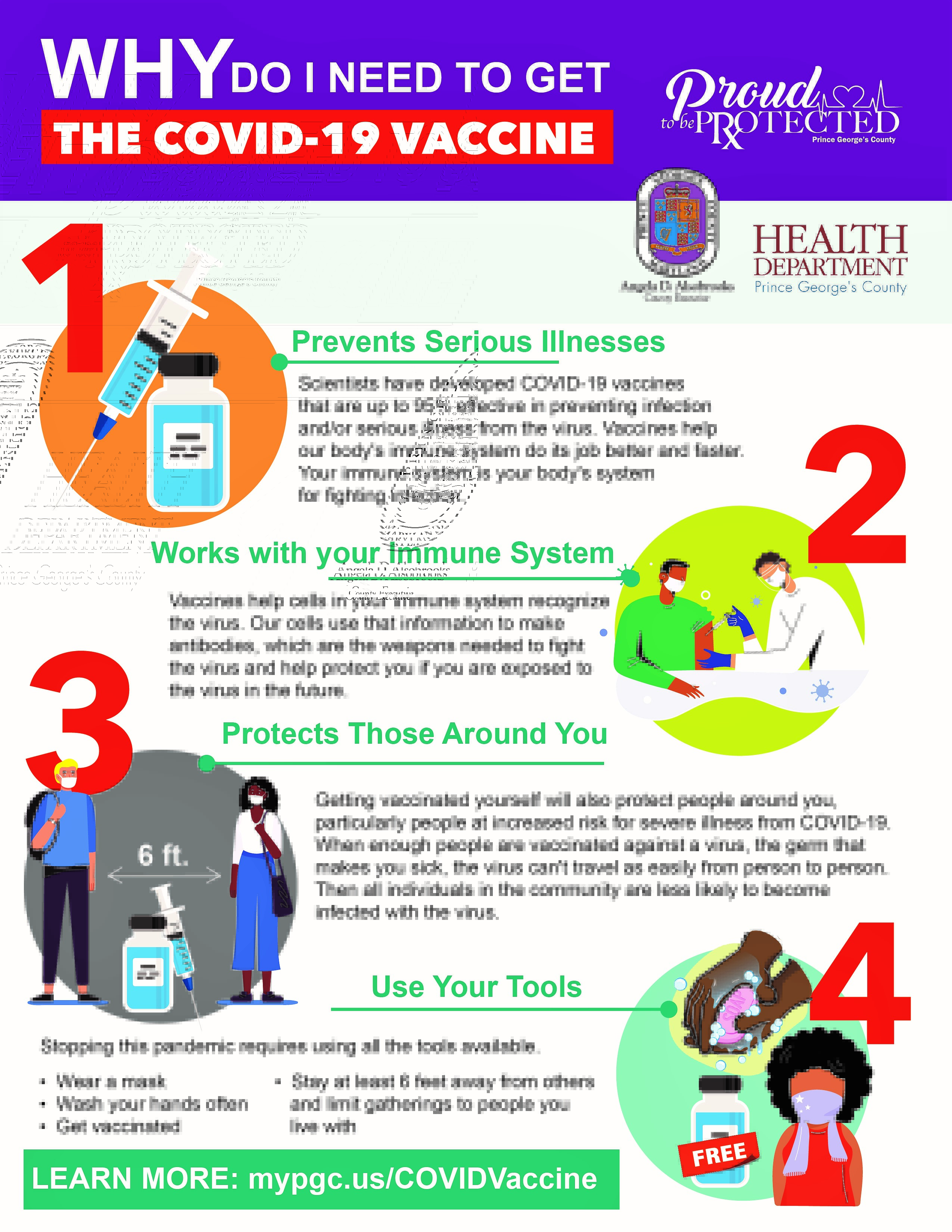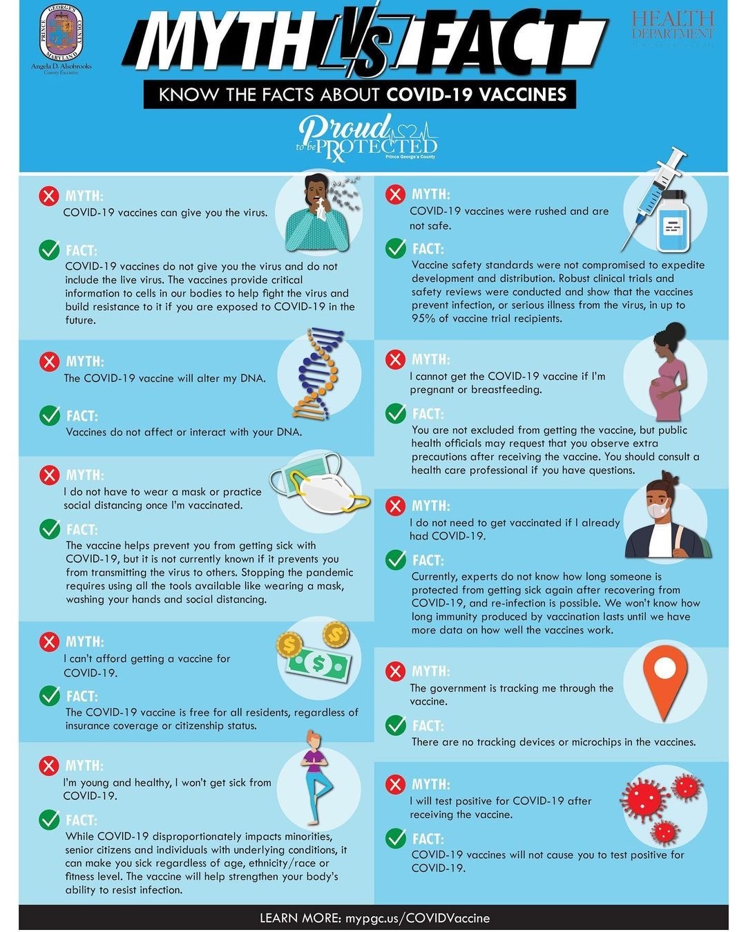 The Prince George's Health Department is working closely with state and federal partners and is committed to keeping all residents, employees, and visitors to Prince George’s County safe and healthy. Additional guidance can be found on the County's official Coronavirus web portal as well as our District 6 COVID-19 Resource section towards the bottom of this newsletter. Residents will find a number of helpful infographics on pre-registering/obtaining the vaccine, helpful information to distinguish the facts versus the myths behind the COVID-19 vaccine and what to expect once you become eligible to receive the vaccine.