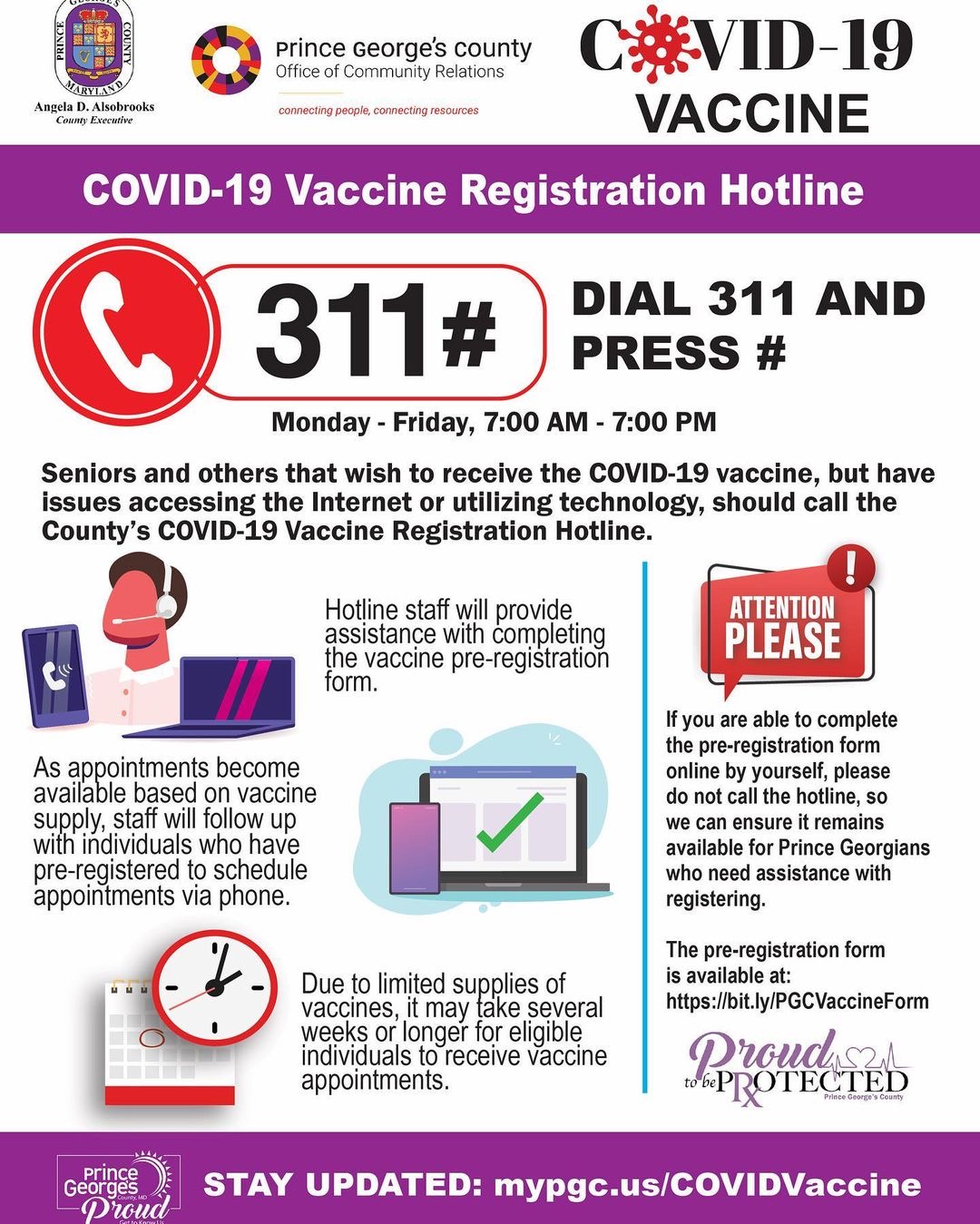 Residents are encouraged to dial "311" and press "#" from 7:00am to 7:00pm, Monday - Friday. Anyone who lives or works in Prince George’s County that wishes to receive the COVID-19 vaccine must fill out the Health Department’s pre-registration form.