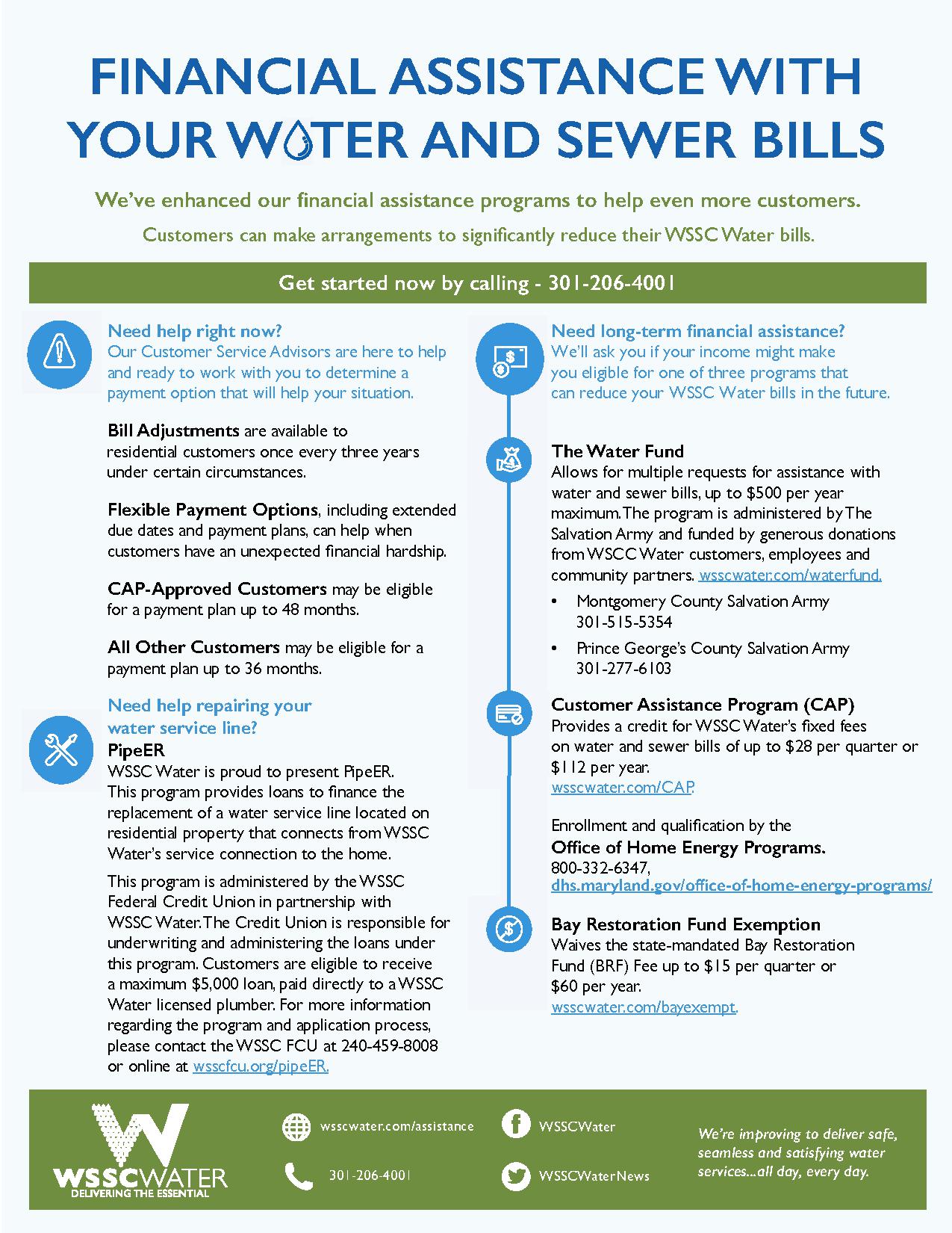 To learn more about WSSC Water’s customer financial assistance programs, please visit: www.wsscwater.com/assistance. For information in Spanish, please go to ww.wsscwater.com/asistencia. Click on the graphic above to view additional details and to download the flyer.