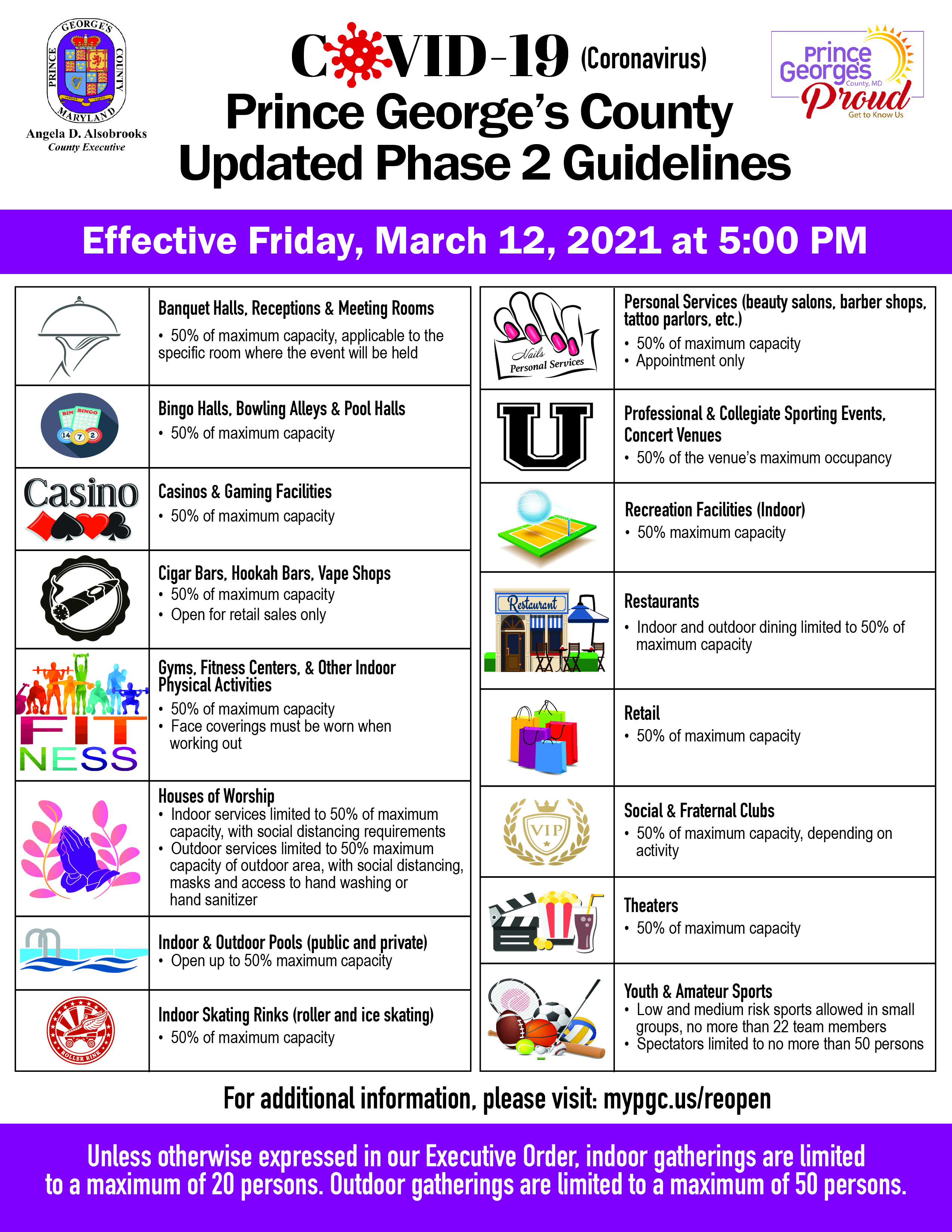 Through Executive Order 8-2021, Prince George's County Executive Angela Alsobrooks announced that on Friday, March 12, 2021, 5 p.m., the County would expand capacity limits for businesses and other establishments. For full guidance on the County’s reopening plan, visit mypgc.us/reopen.