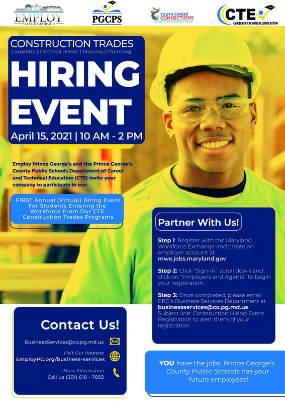 Employ Prince George's and the Prince George's County Public Schools Department of Career and Technical Education (CTE) invite your company to participate in the first Annual (Virtual) Hiring Event for students entering the workforce from the CTE Construction Trades Programs.