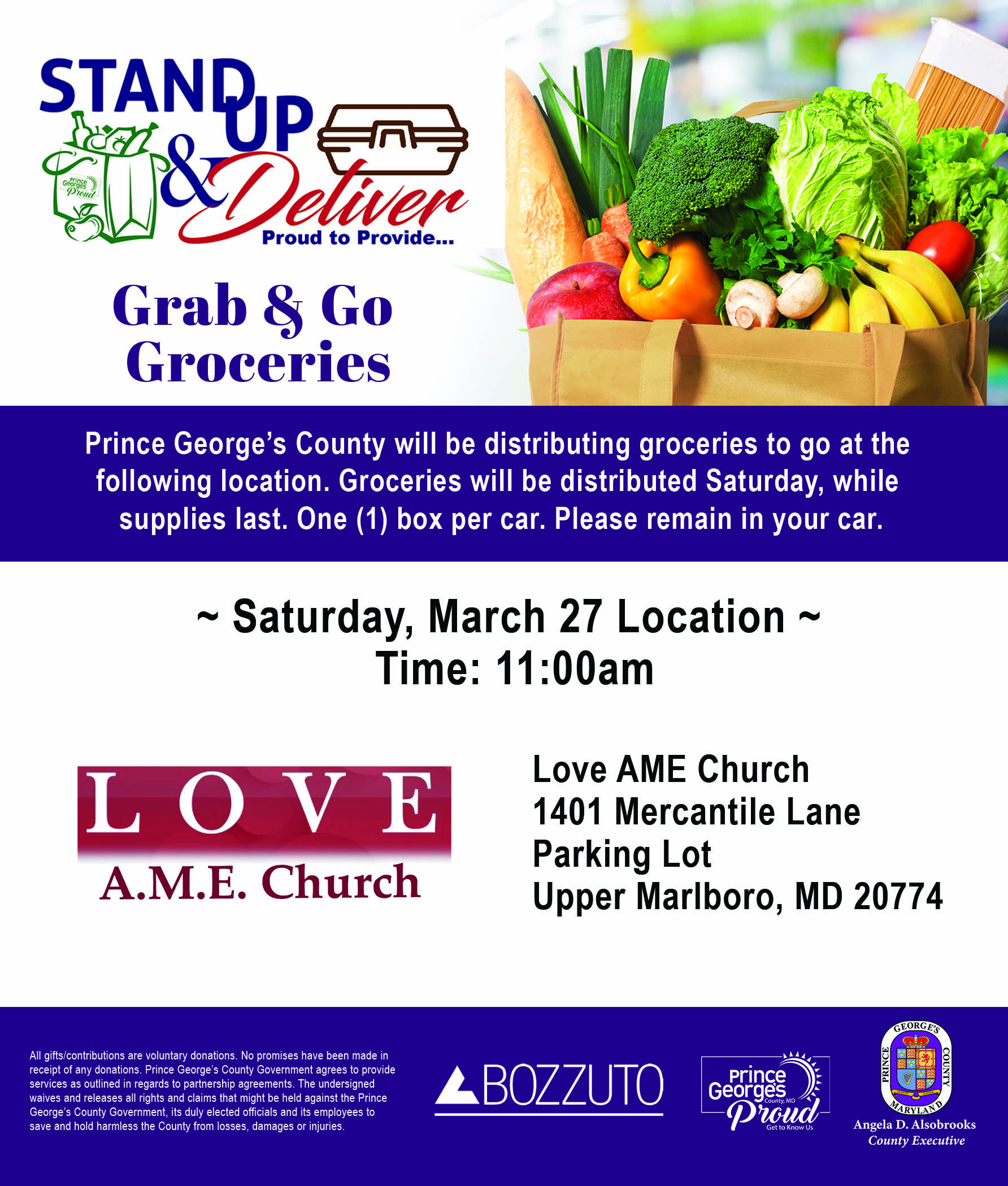 Through the County’s Stand Up & Deliver program, Prince George’s County will distribute groceries and meals to go today, Saturday, March 27 and Sunday, March 28 at multiple locations throughout the county.