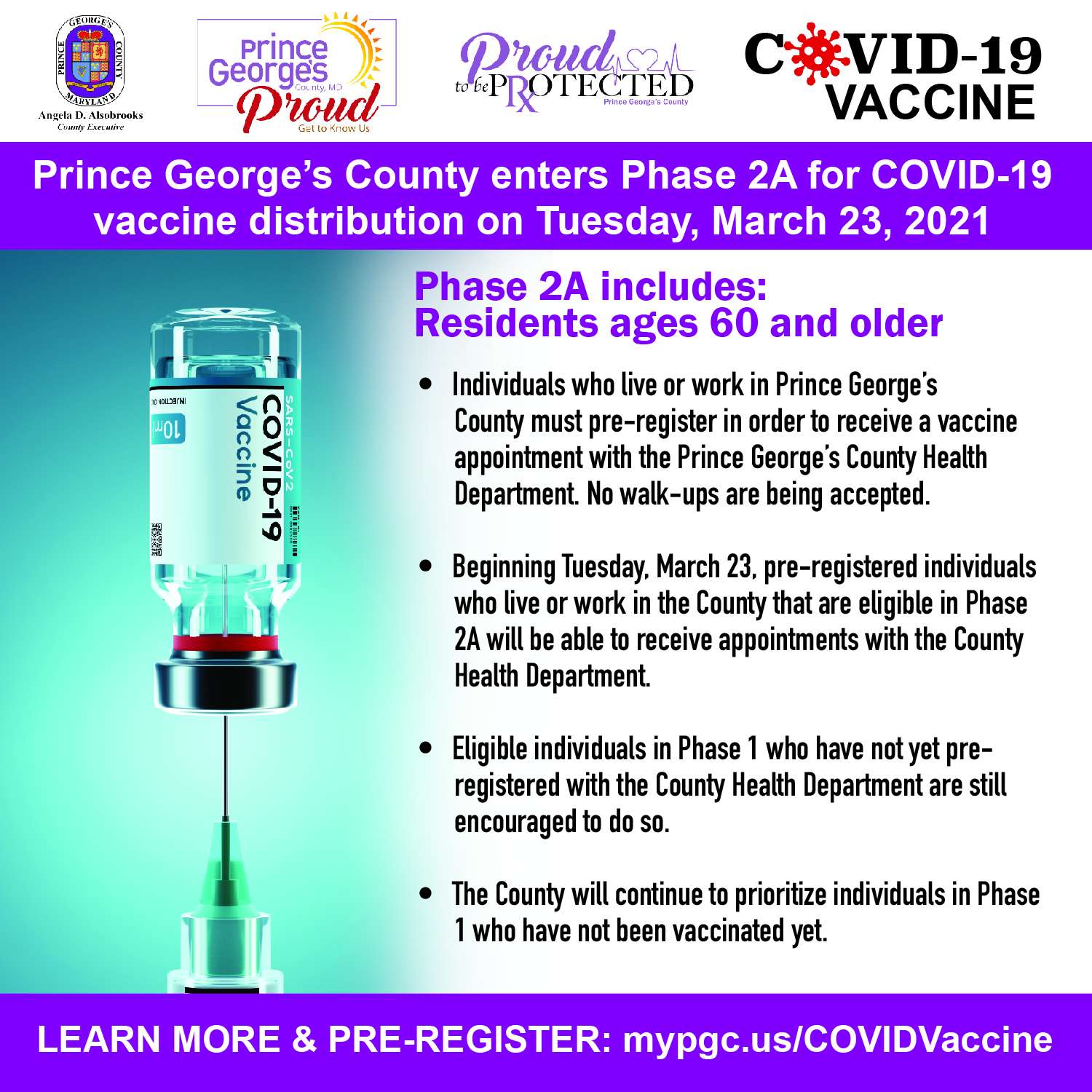 As a reminder, Prince George’s County entered Phase 2A for vaccine distribution on Tuesday, March 23, 2021.