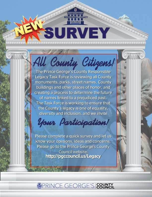 Residents are asked to respond to the survey questions on the Council website at pgccouncil.us/Legacy no later than Wednesday, March 31, 2021. Click on the graphic left to view additional details and to download the flyer.