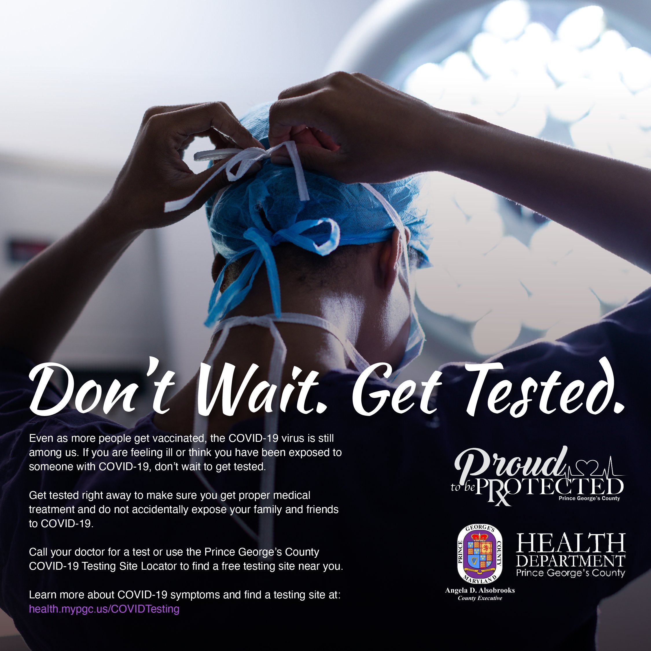Call your doctor for a test or use the Prince George's County COVID-19 Testing Site Locator to find a free testing site near you. Learn more about COVID-19 symptoms and find a testing site at the County's official COVID Testing Site.