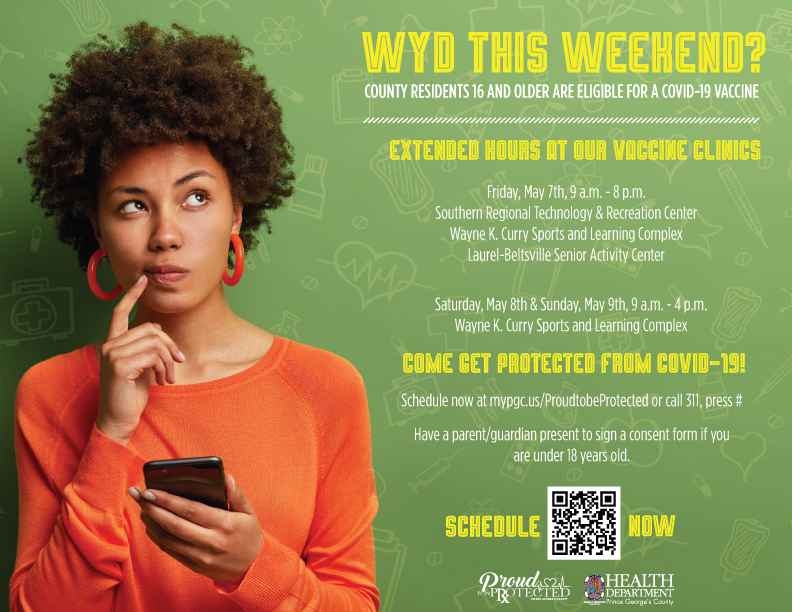 the following County-operated COVID-19 vaccination clinics this weekend at the Wayne K. Curry Sports & Learning Complex: Saturday and Sunday, May 8 and 9, 9:00 AM to 4:00 PM. Appointments for these extended-hour clinics are required. Individuals can schedule their own first-dose appointments by visiting mypgc.us/ProudToBeProtected and selecting one of the clinics on May 7, 8, or 9. The clinics are open to County residents 16 and older. Those who are 16 or 17 years old must have a parent or guardian with them at the clinic to fill out a consent form. For more information about the County’s vaccination operations, please visit our COVID-19 vaccine webpage mypgc.us/COVIDvaccine.