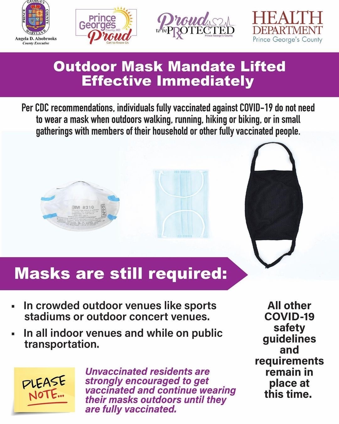 At the advice of County health officials and following CDC recommendations, masking is no longer required for most outdoor activities in Prince George’s County. However, masks are still required in outdoor venues like sports stadiums or outdoor concert venues, and also in all indoor venues and on public transportation. Unvaccinated residents are strongly encouraged to get vaccinated and continue wearing their masks outdoors until they are fully vaccinated.