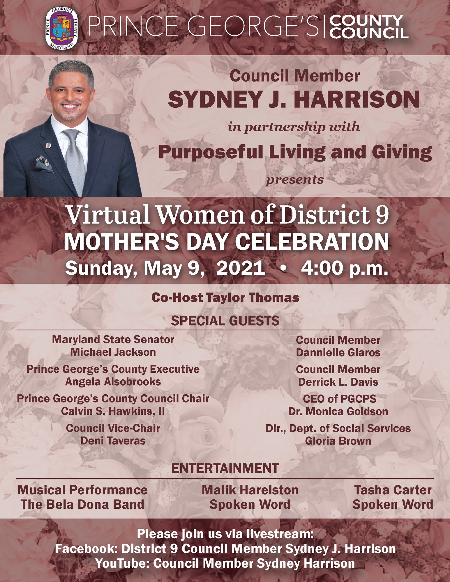 Looking for a virtual Mother's Day event to attend? Please join my Council colleague, Prince George's County Council Member Sydney Harrison and Purposeful Living and Giving, this Sunday, May 9, at 4:00 p.m for the District 9 Virtual Mother’s Day Celebration. Several of my Council colleagues and I will participate in this entertaining event to celebrate and recognize the wonderful and loving mothers, throughout our community. Taylor Thomas (radio and television personality) and Council Member Sydney Harrison will serve as the co-hosts of the event. You don't want to miss a special musical performance by Be’la Dona Band and an inspirational spoken word offering by Tasha Carter and Malik Harleston. To view the live stream, please click on either of the following links: District 9 Mother's Day Celebration on YouTube or District 9 Mother's Day Celebration on Facebook Live.