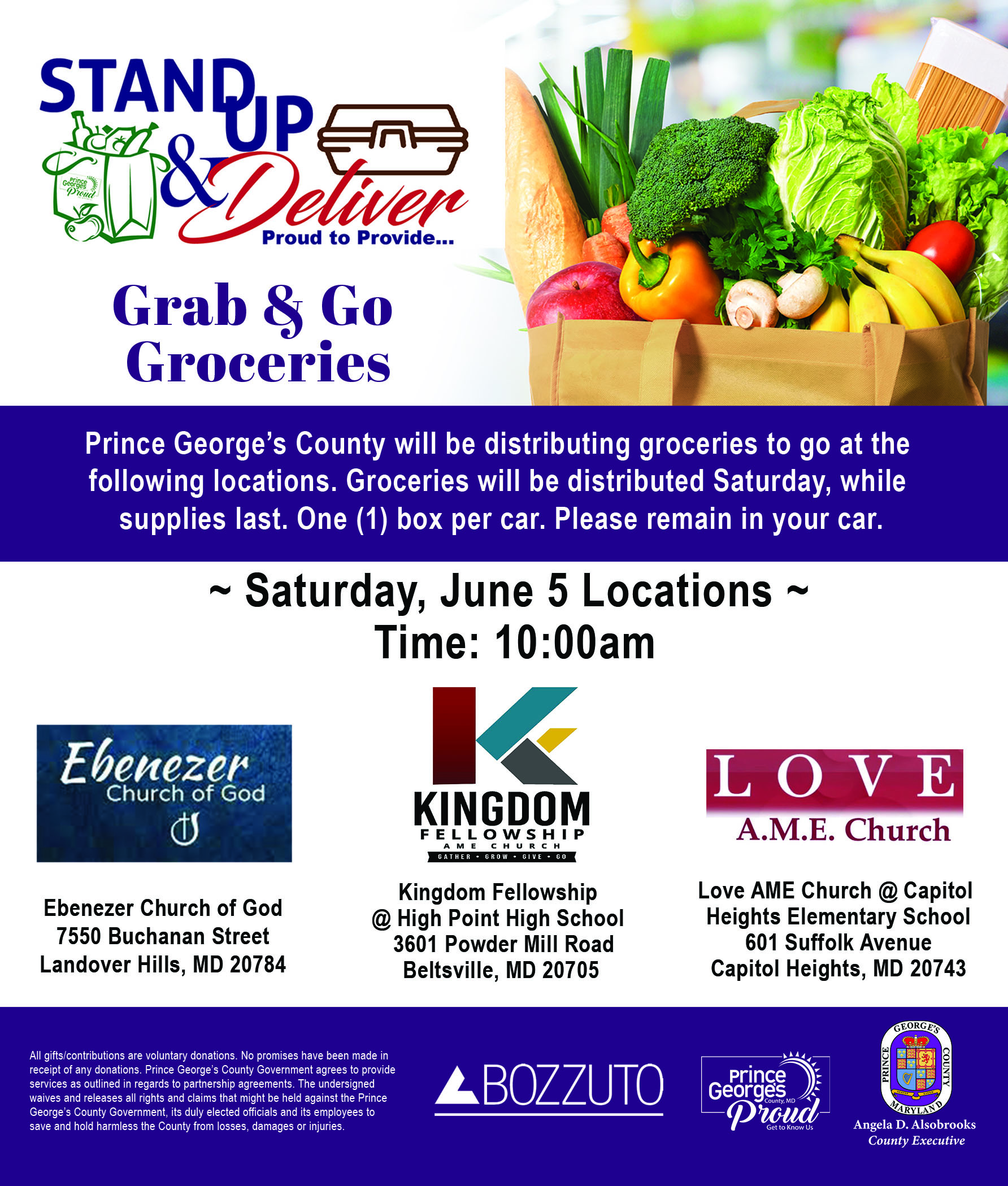 Through the County’s Stand Up & Deliver program, Prince George’s County will distribute groceries and meals to go today, Saturday, May 29 and Sunday, May 30 at multiple locations throughout the county: