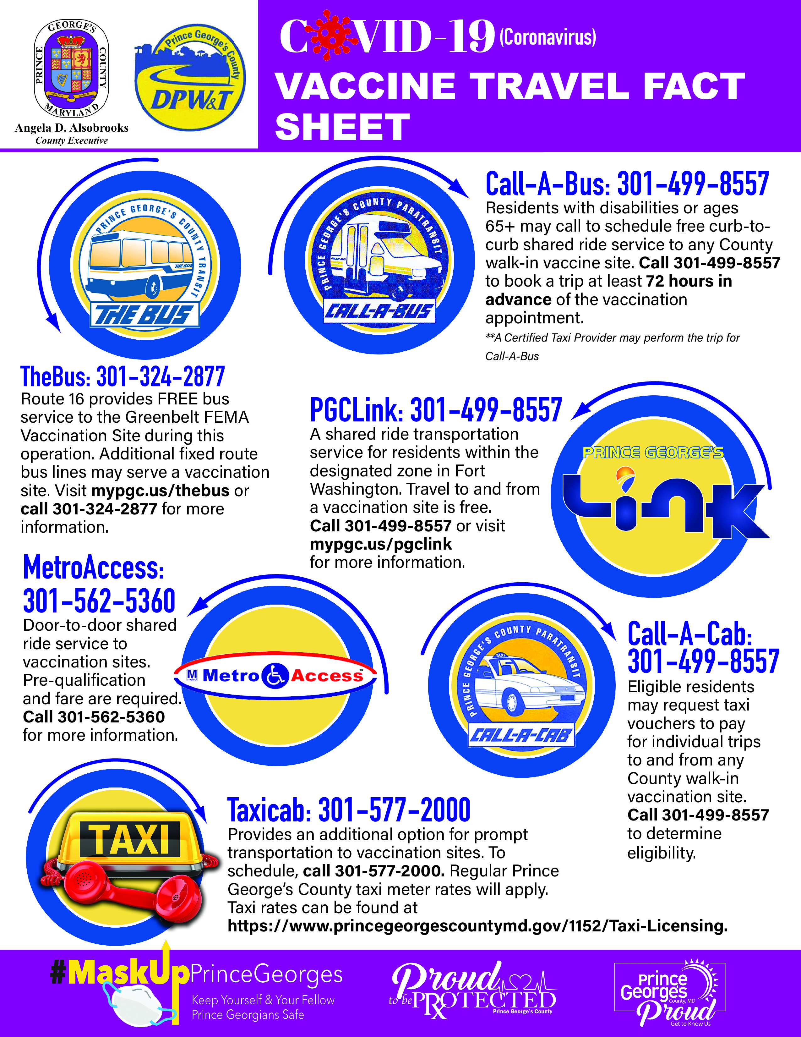 Click the flyer above to view additional details on County transit options to consider in receiving the COVID-19 vaccine including The Bus, Call-A-Bus, PGCLink, MetroAccess, Taxicab and Call-A-Cab.