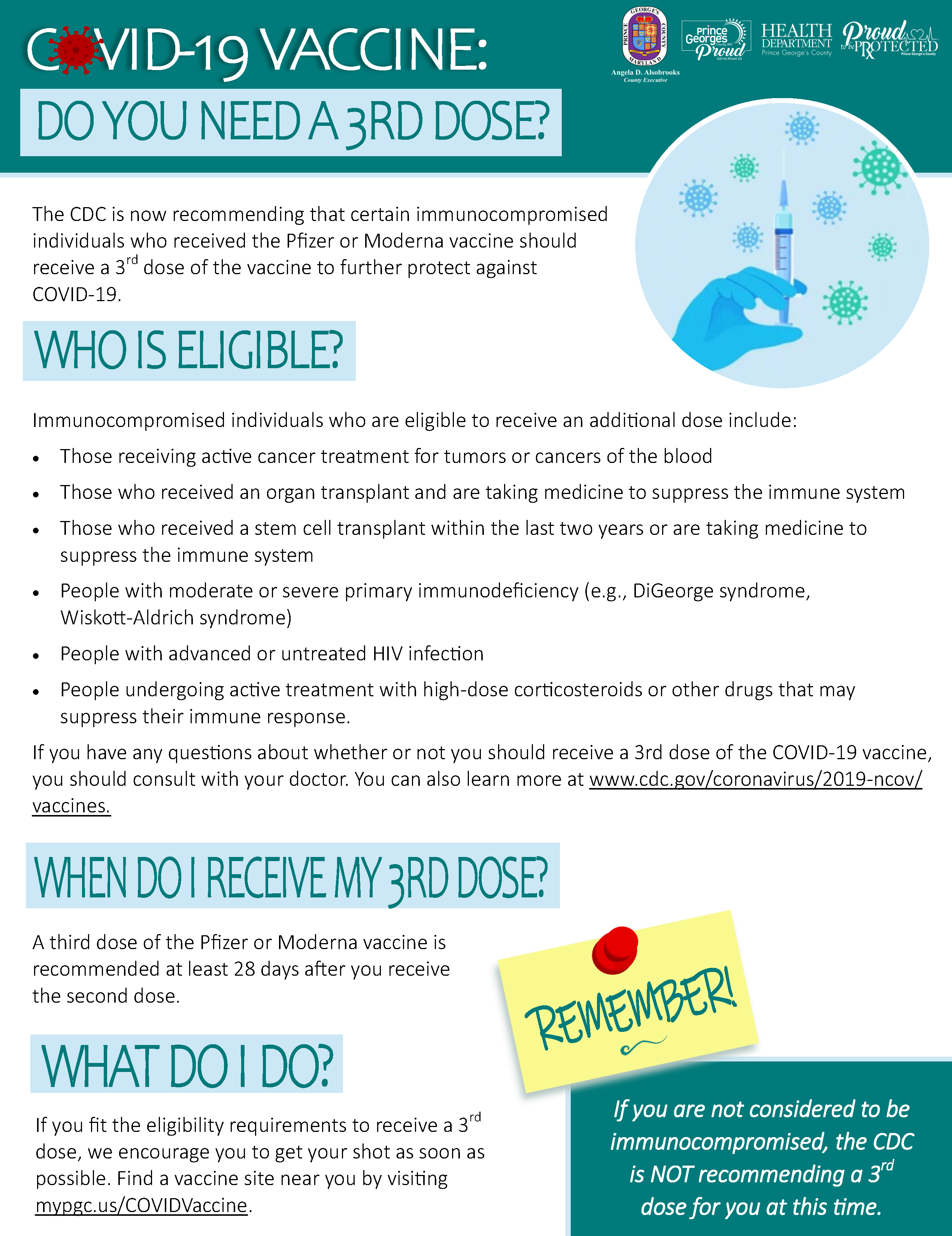 Residents can find out more about eligibility for a third dose or booster shot, as well as find the nearest COVID-19 vaccine clinic, at mypgc.us/COVIDVaccine and by reviewing the infographic on 3rd doses for immunocompromised individuals below.