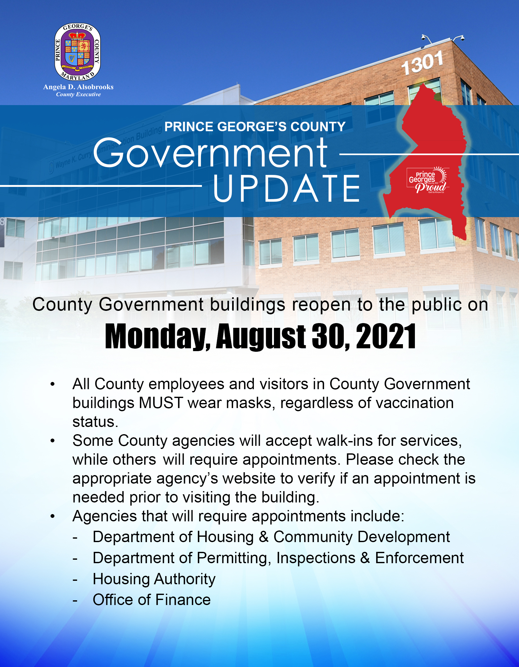 Please note that most County Government agencies will resume normal operations, encouraging residents to make appointments while also accepting walk-ins. Some agencies will require residents to make an appointment to receive in-person services. Residents are encouraged to review an agency’s website to verify if an appointment is needed prior to visiting, and for instructions on how appointments can be scheduled.