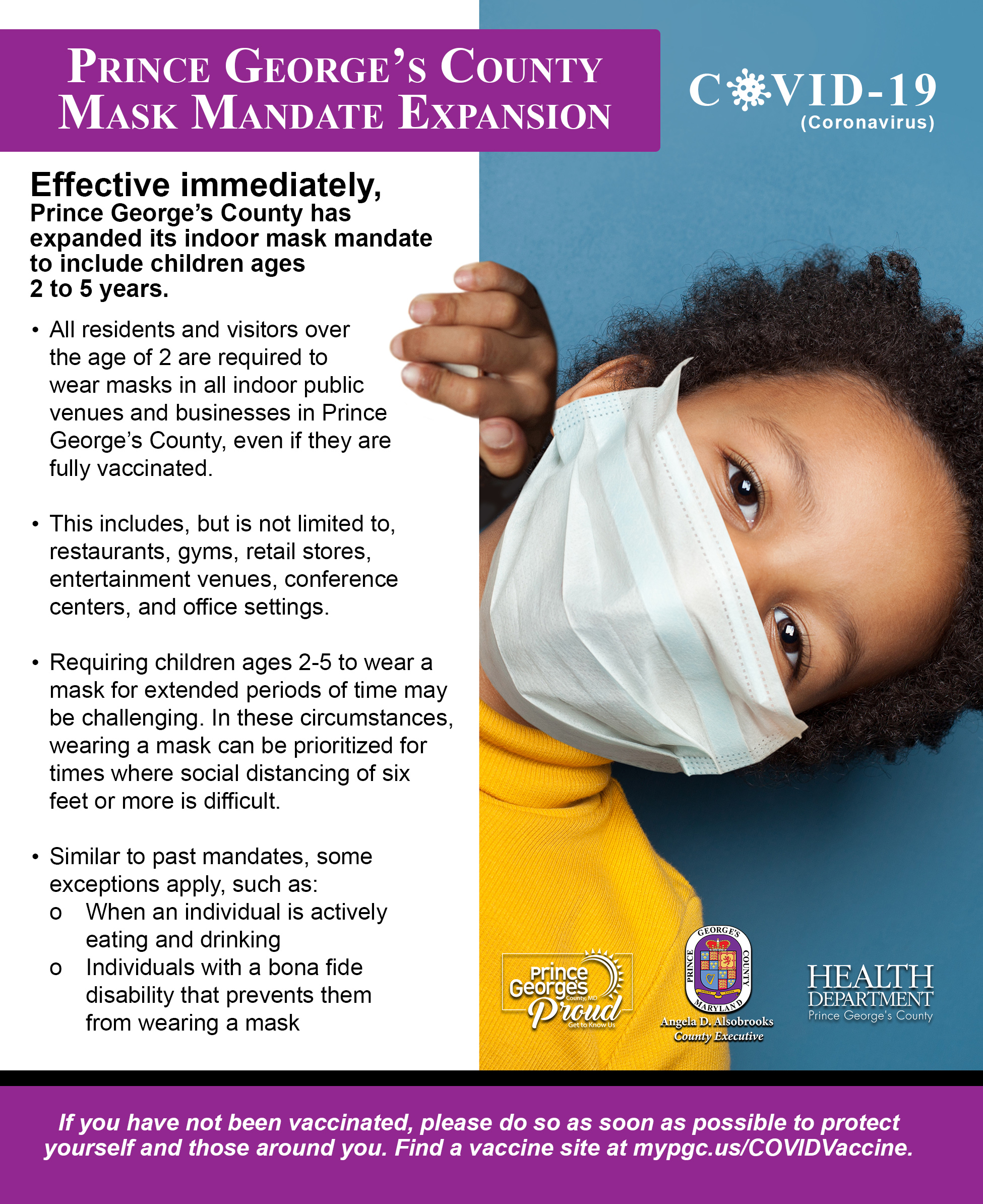 Please be advised that effective Wednesday, October 6, 2021, all Prince George's County residents and visitors over the age of 2 are required to wear masks in all indoor public venues and businesses in Prince George’s County. “From the outset of this pandemic, we have been focused on policies that support the health and safety of our residents, while also ensuring residents and businesses have the resources they need to get by,” said Prince George's County Executive Angela Alsobrooks. “We want to thank Prince Georgians for working together through this pandemic, because we have shown that we are a strong and resilient community where residents can always count on one another.” To watch the press conference in its entirety, please visit the following embedded weblink. You may also review the official press release to gather additional details on the mask mandate expansion.