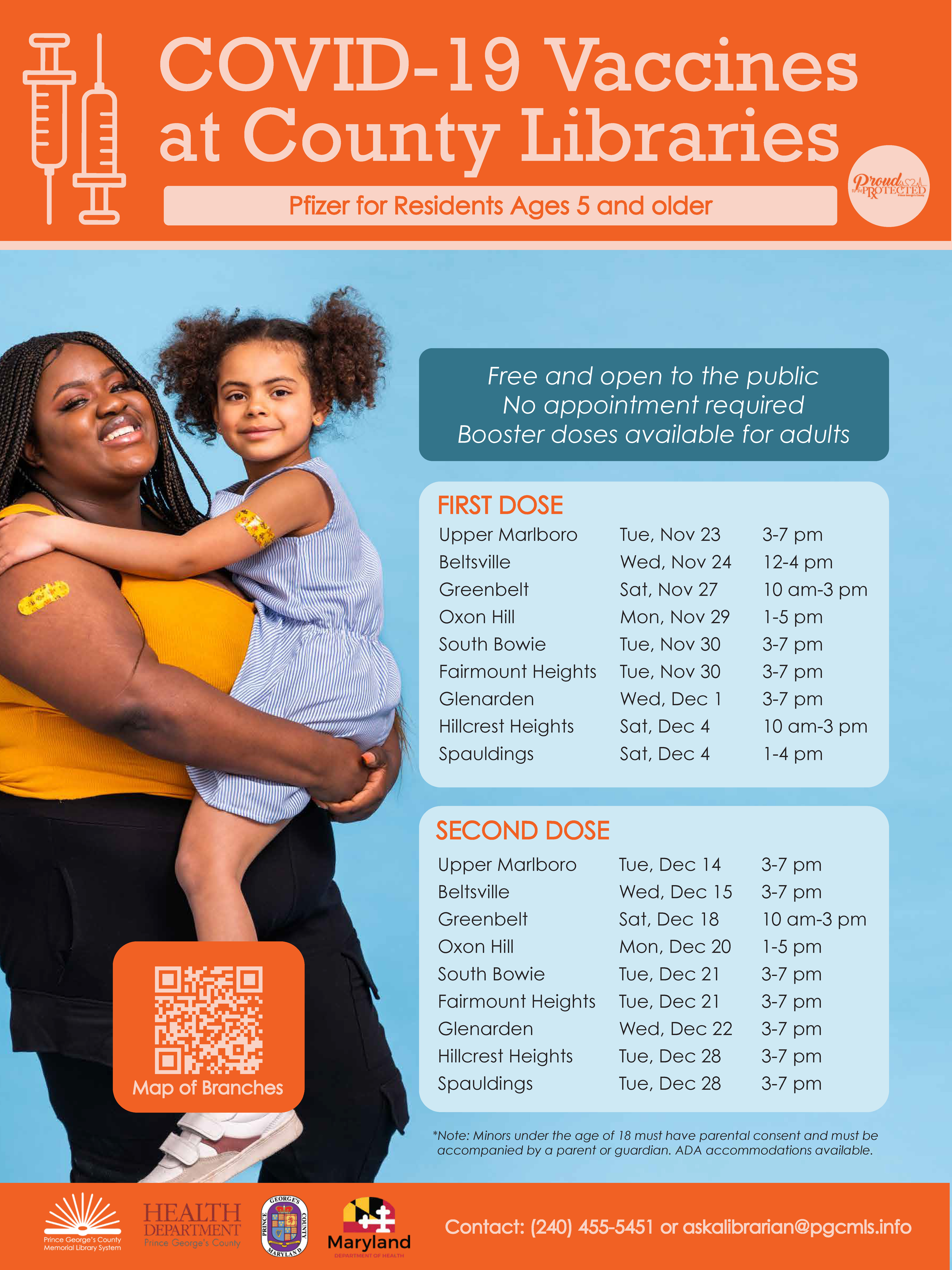 The Prince George’s County Memorial Library System is hosting free COVID-19 vaccination clinics for County residents in need of their second dose at select branches beginning Tuesday, November 23. The Pfizer COVID-19 vaccine will be available for County residents ages 5 and up.