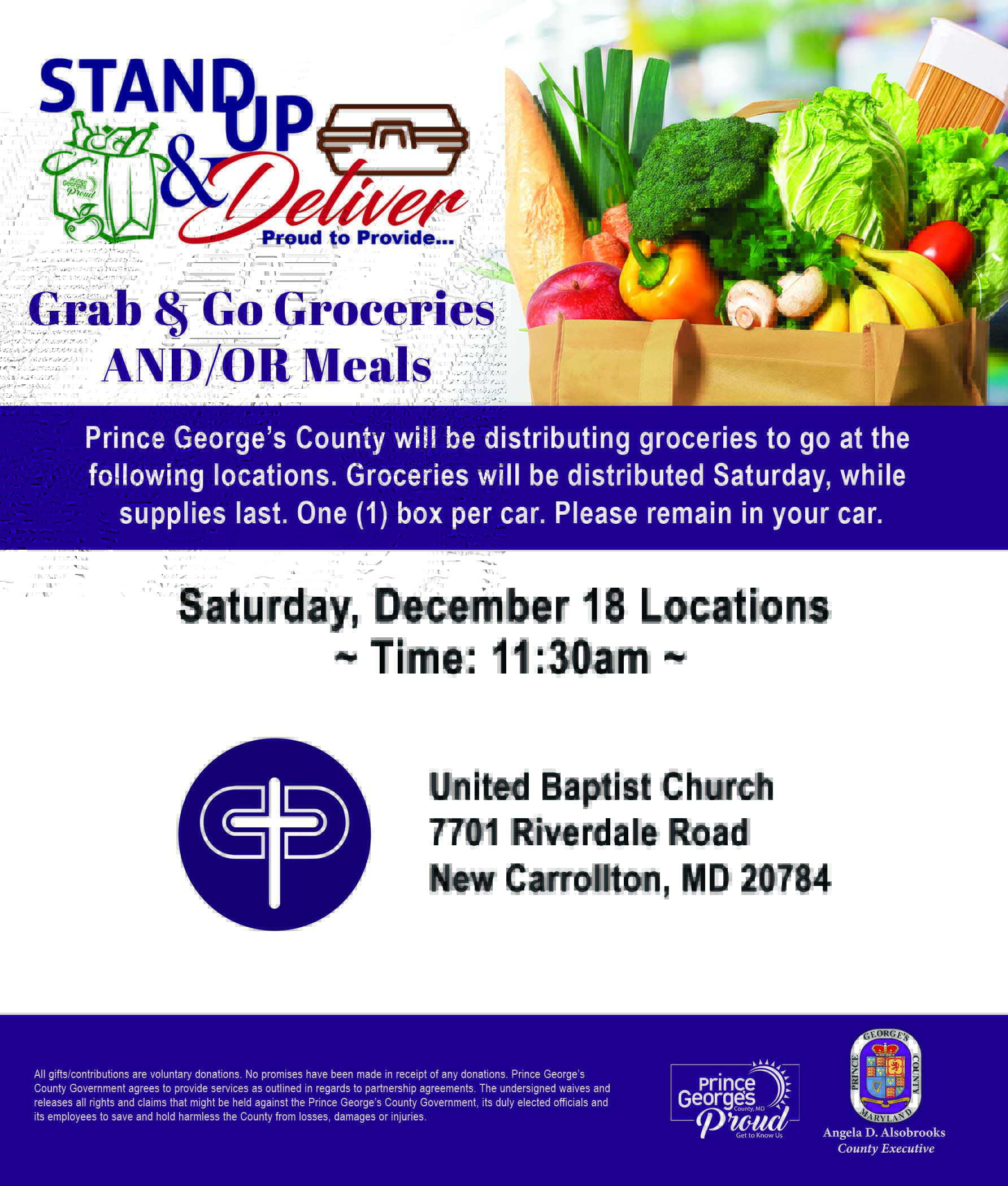 Through the County’s Stand Up & Deliver program, Prince George’s County will distribute groceries and meals to go today, Saturday, December 18 , 11:30am, at United Baptist Church, located at 7701 Riverdale Road, New Carrollton, Maryland 20784.
