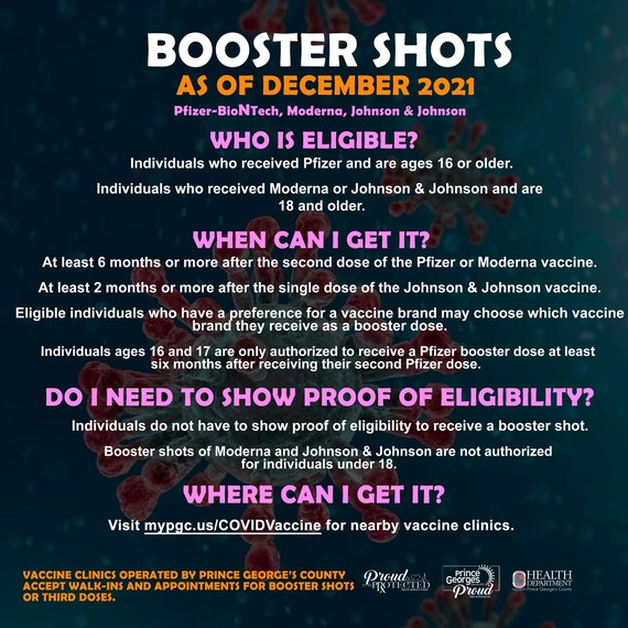 The Prince George’s County Health Department’s COVID-19 vaccination clinics offer booster shots of Pfizer, Moderna, and Johnson & Johnson COVID-19 vaccines to any County resident age 18 and older following the FDA’s emergency use authorization, the CDC’s official recommendation, and the State of Maryland’s approval.