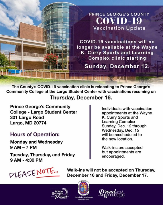 The County’s COVID-19 vaccination clinic relocated to Prince George’s Community College at the Largo Student Center with vaccinations resuming this week.