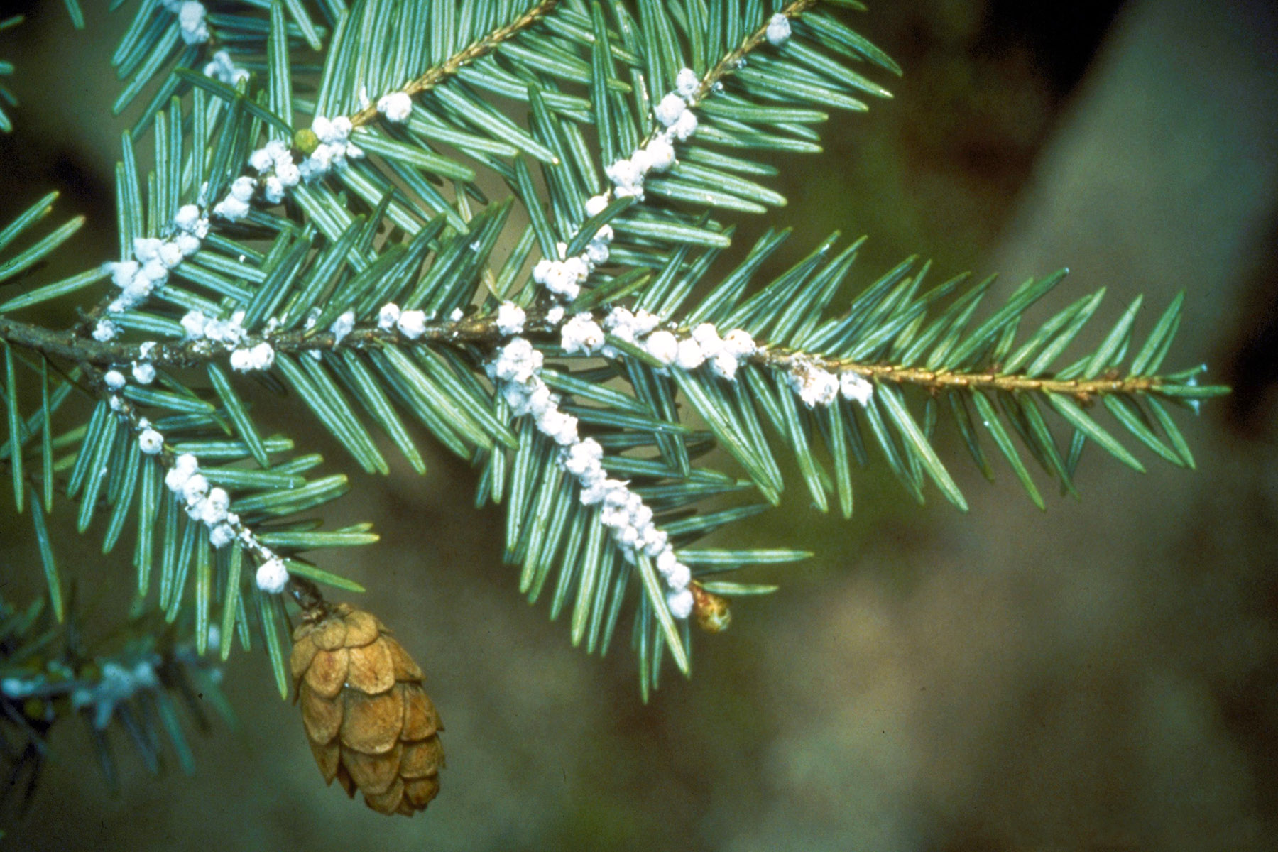Often over-looked, clusters of HWA appear as small cotton-ball like masses on the undersides of hemlock twigs. They can be easily identified when viewed up close. If you suspect you have seen HWA, mark the branch, take a picture or sample and contact the Maine Forest Service. Report suspected HWA online or call (207) 287-2431.