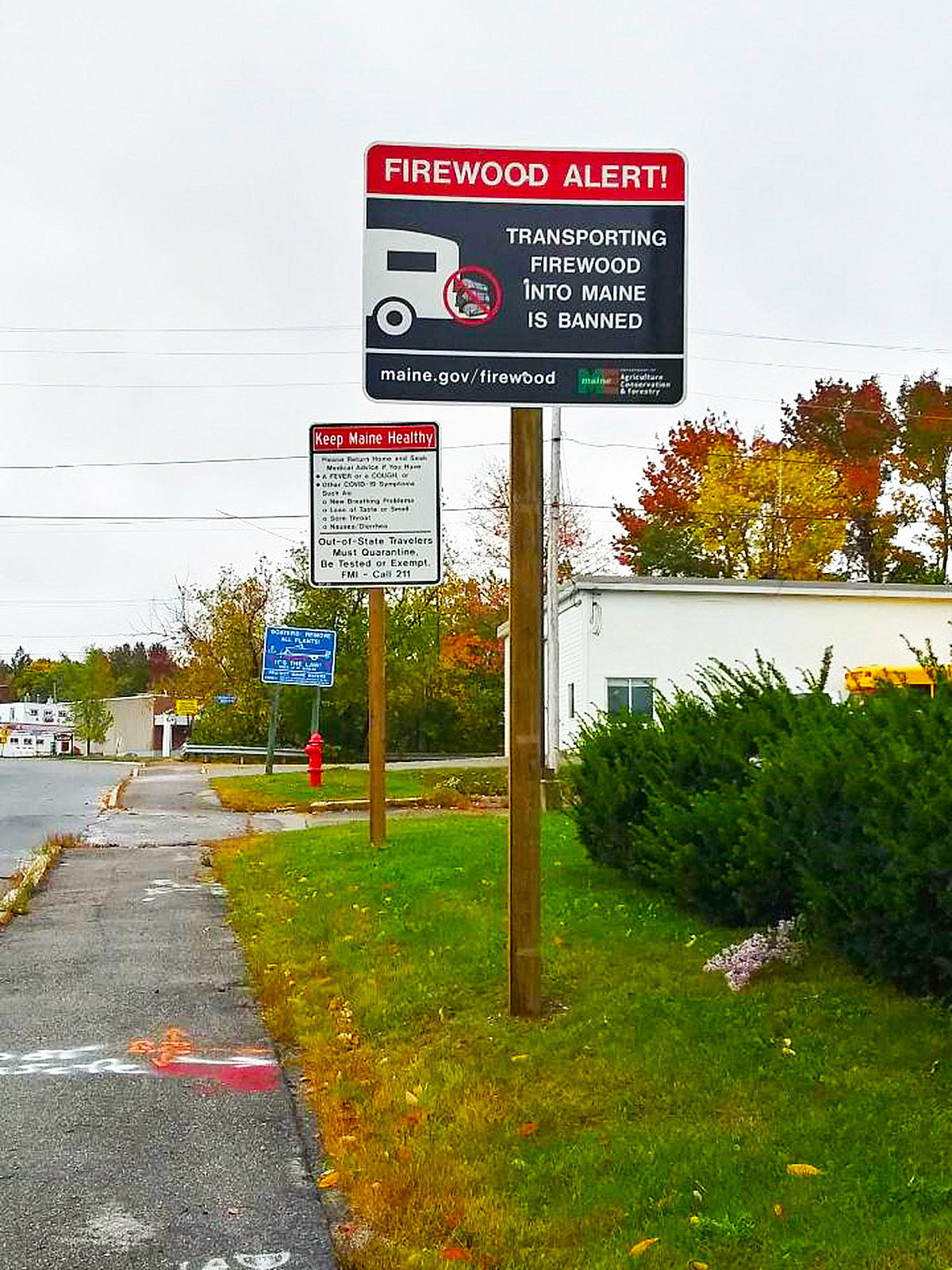"Invasive threats not yet found in Maine as well as those already in Maine like the emerald ash borer and hemlock woolly adelgid are killing trees in Maine and many nearby states," commented Gary Fish, State Horticulturalist. "DACF's mission with these signs is to educate everyone entering and traveling around Maine, that out of state firewood is banned, and moving firewood within our state threatens to worsen the devastating impact of invasive pests and diseases on our forests."