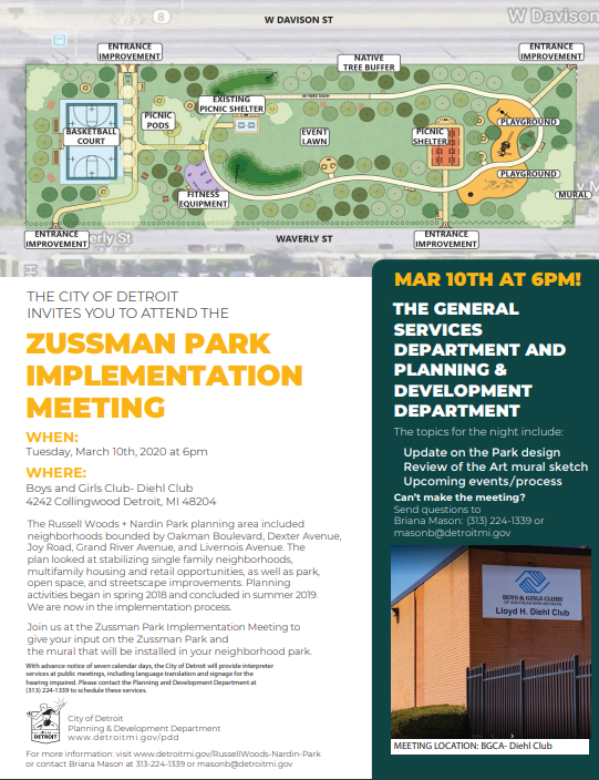 Zussman Park Implementation Meeting - March 10 City of Detroit, Michigan sent this bulletin at 02/28/2020 10:00 AM EST Having trouble viewing this email? View it as a Web page. ZussmanPark.PNG