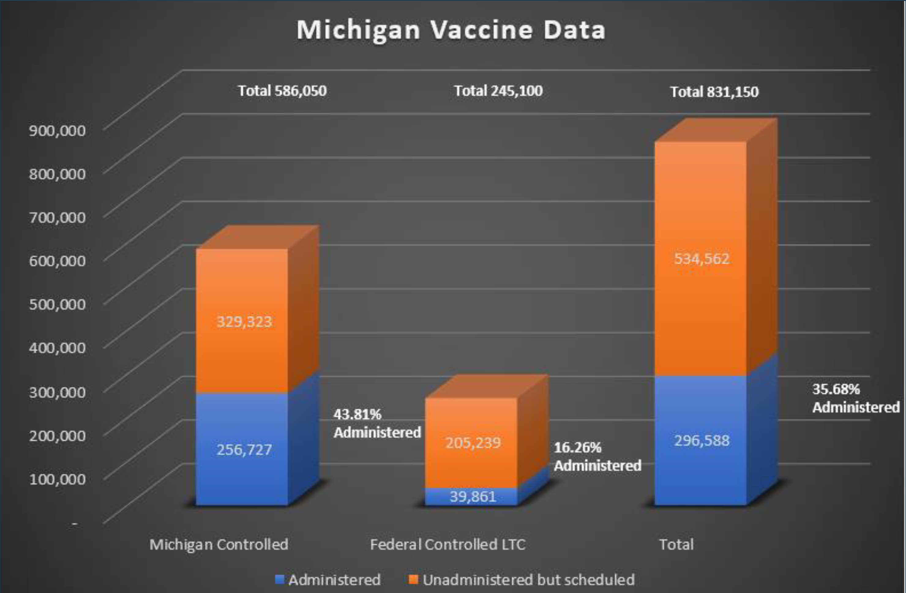 Every dose of the vaccine that the state of Michigan has received has been delivered to a provider. We thank every provider for making sure those doses have been scheduled and/or administered. In Michigan, we have distributed 831,150 vaccines to state partners for administration. An additional 245,100 have been allocated to the federal program for administration in long-term care facilities. We have reported administering 332,139 of vaccines for priority groups. This data is current data as of January 13. (View full size chart.)