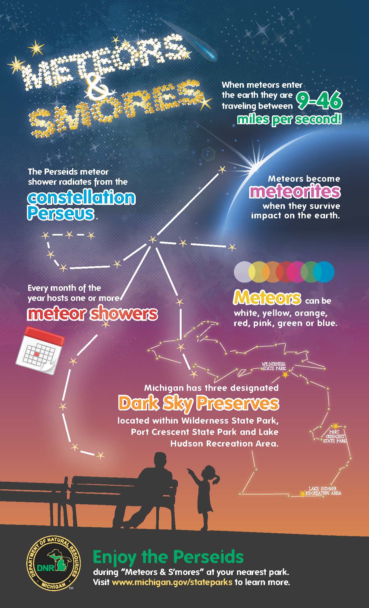 For more information about Meteors & S'mores events at Michigan state parks and recreation areas, check the event listings at www.michigan.gov/gogetoutdoors or contact Elissa Buck (western Michigan) at 989-313-0000 or Stephanie Wirtz (eastern Michigan) at 989-686-2790. For specific information about a state park, contact the park directly.