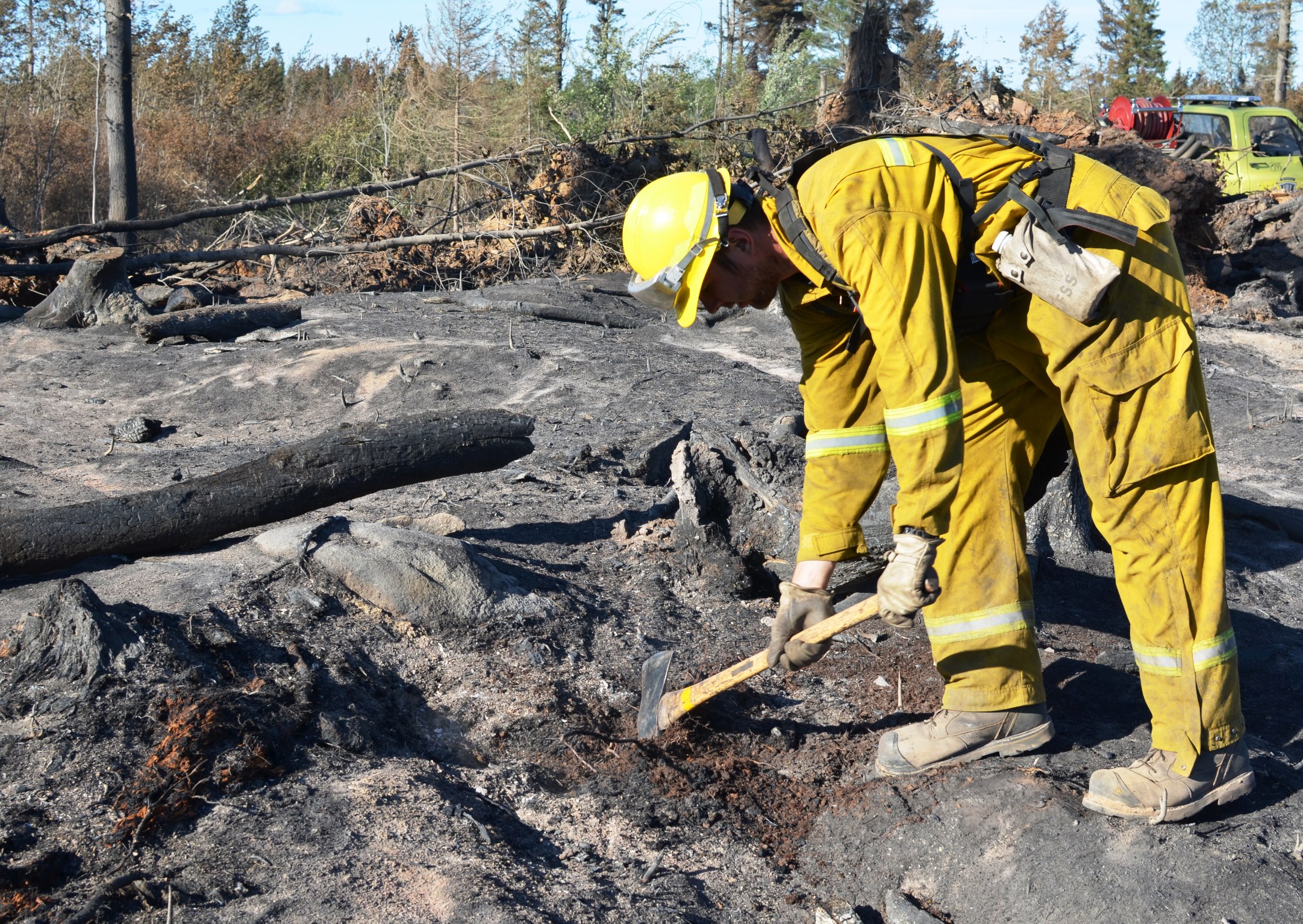 Pulaski: Michigan Department of Natural Resources fire crew member Jacob Burton of Ishpeming works with a Pulaski fire tool to put out a hot spot on the fire.