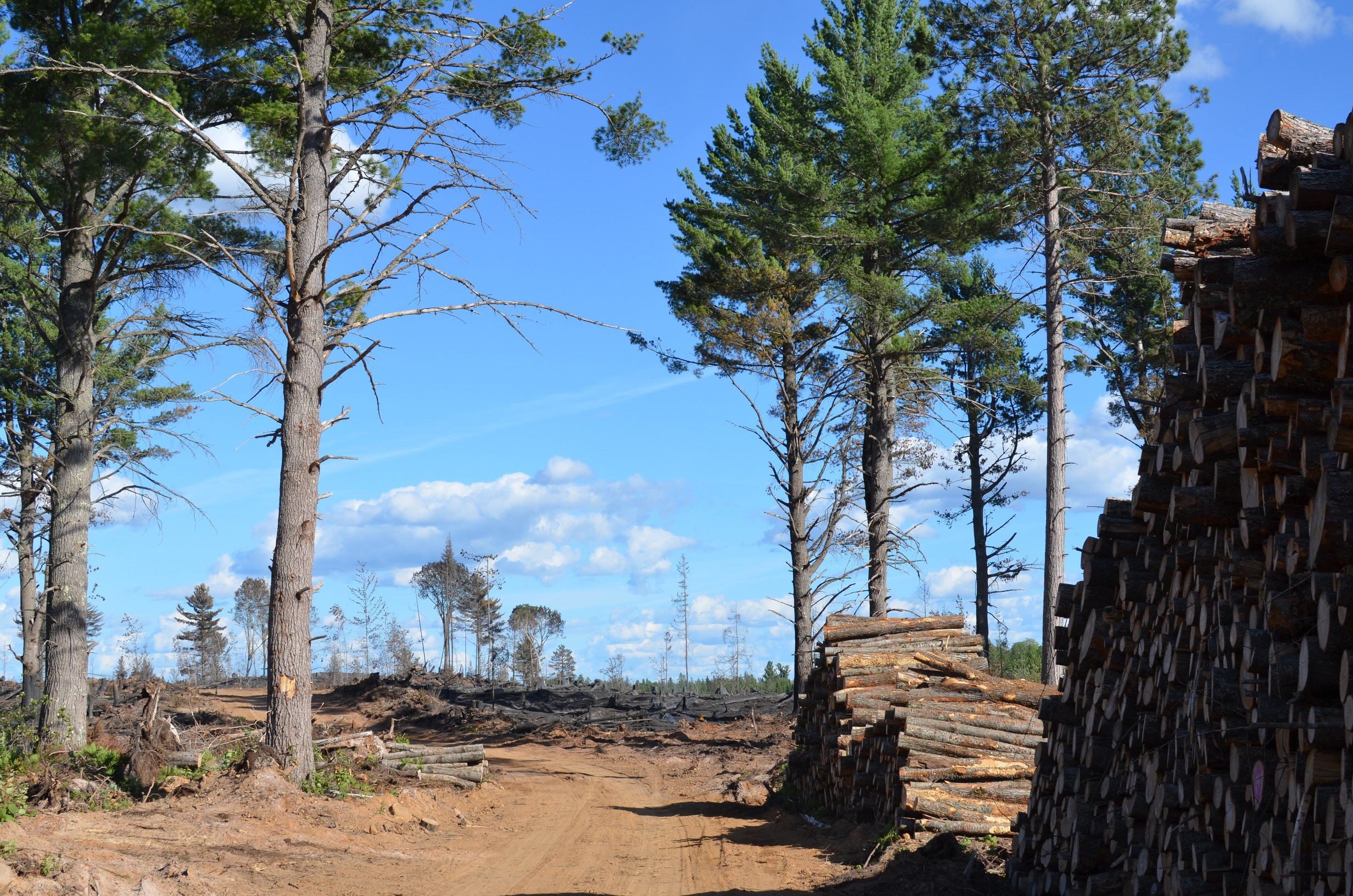 Logs: Stacked pulpwood in the foreground shows the type of wood piles that burned in the blaze since it broke out Thursday afternoon. In the distance, the blackened fire area is visible.