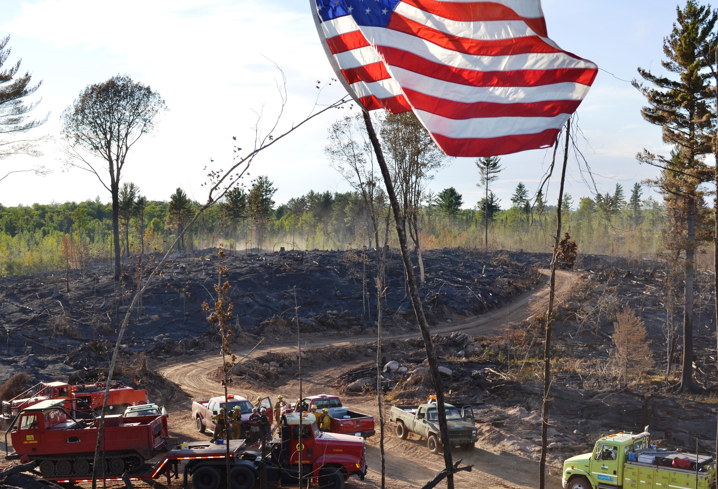 Flag: As a tradition, DNR firefighters in some units raise an American flag once a fire is 100-percent contained. This flag was flying over the “County Road 601” wildfire Saturday evening./