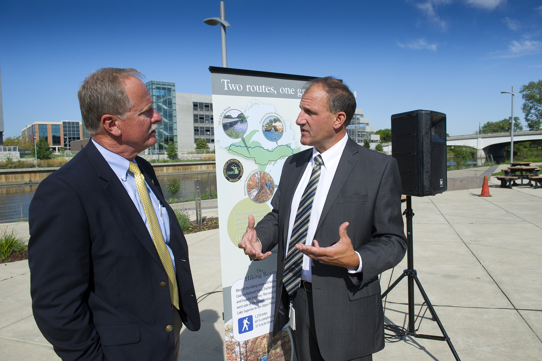 DNR Director Creagh and TransCanada Peter Jakoski: Michigan DNR Director Keith Creagh (left) talks with Peter Jaskoski, director of Government Relations at TransCanada, about funding for development of Michigan's Iron Belle Trail./