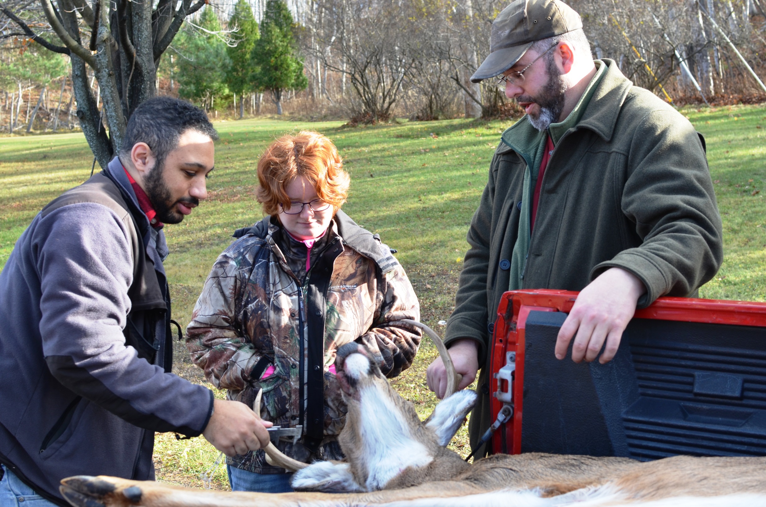 Students: Northern Michigan University students Nate Kirkland, left, and Ashely Adams check in a deer at the Marquette DNR check station under the supervision of Bill Scullon, DNR field operations manager from the Norway Field Office./