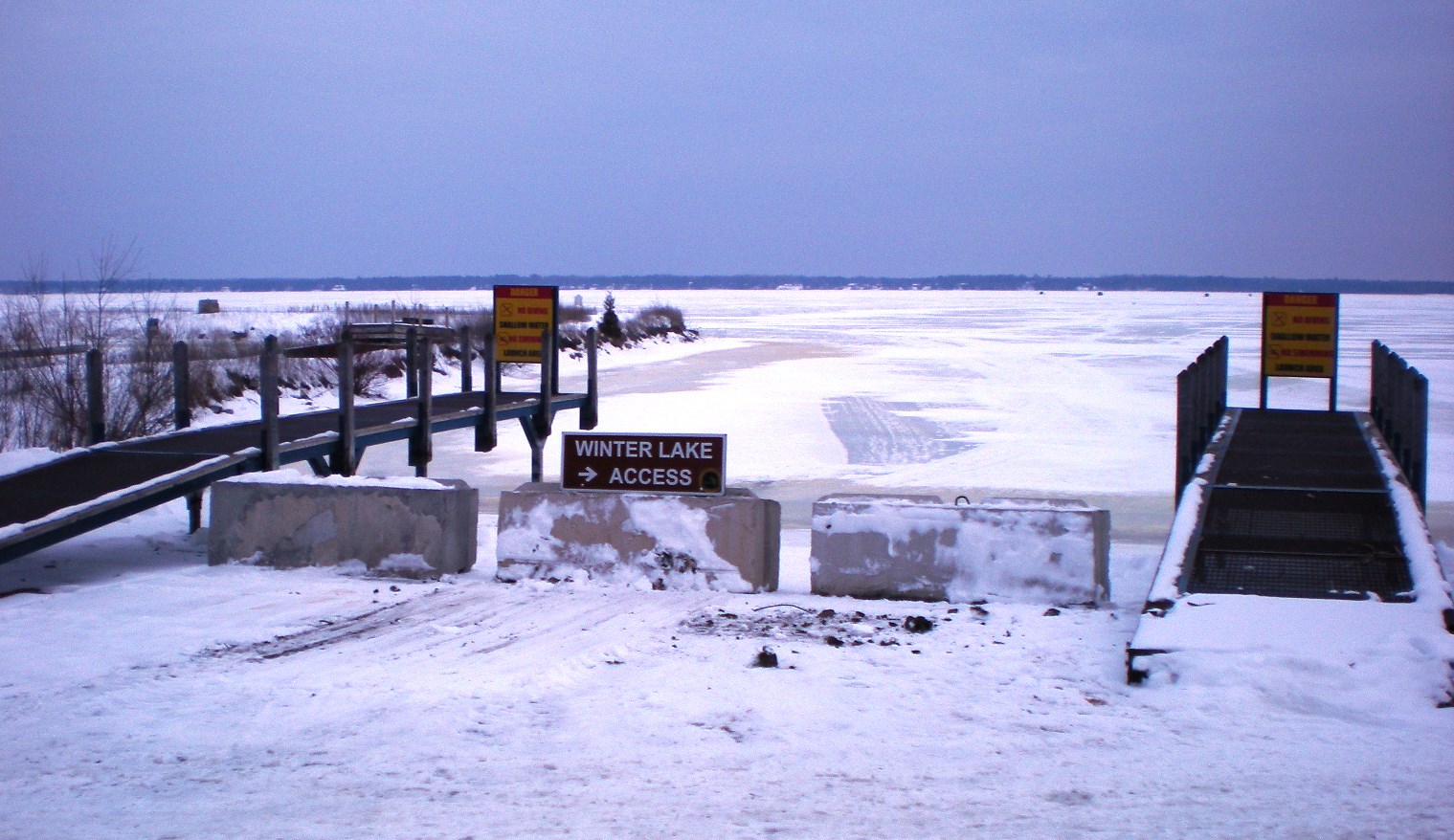 Kipling boat launch: The Kipling and Ford River boating access sites are open for ice fishing and vehicles may enter the area. However, vehicles are not allowed on the boating launch ramps. The closed Kipling ramps are shown./