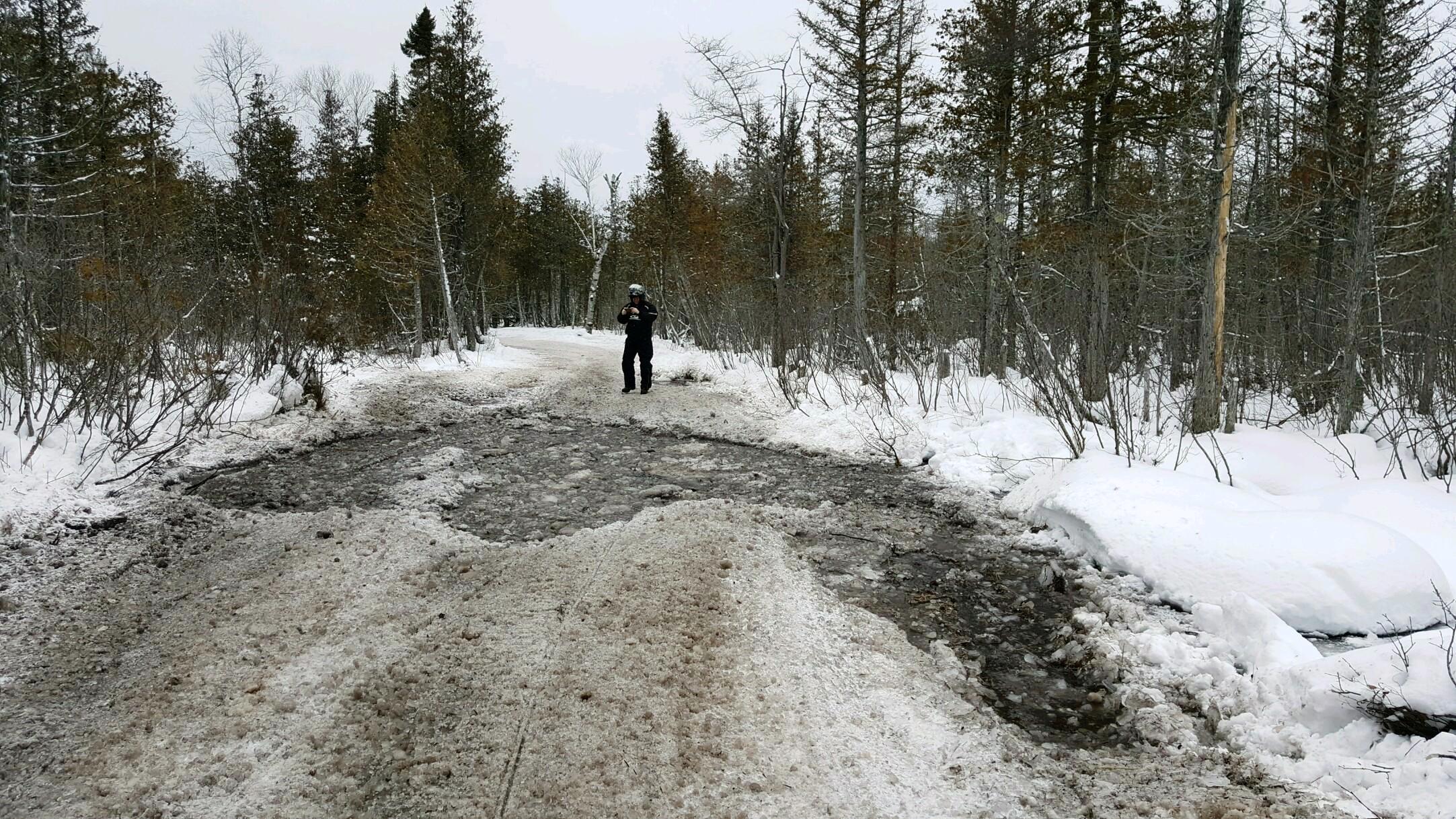 Warmer temperatures in recent days have caused ice to melt and water to back up near the mouth of the Tahquamenon River. Water has pooled over part of the trail in a lowland area, causing unsafe riding conditions.