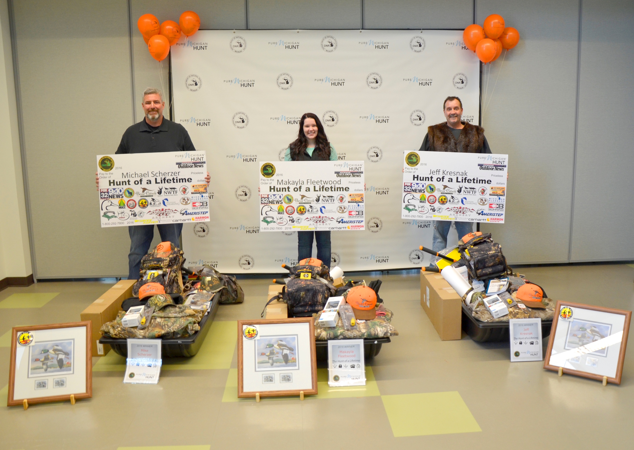 2016 Pure Michigan Hunt winners with prizesMike Scherzer of Freeland, Jeff Kresnak of Caledonia and Makayla Fleetwood of Bloomingdale – the most recent winners of the Pure Michigan Hunt drawing – all came to February’s Natural Resources Commission meeting in Detroit to take home their winnings.