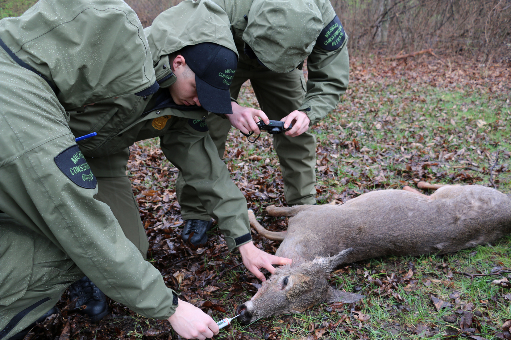 Time of death determinor.jpg: Recruits use their evidence kits to determine a deer’s time of death during a crime scene scenario. (The deer used in the scenario was found dead alongside the road days prior, resulting from a deer-vehicle collision. After being tested at the DNR laboratory for disease, it was transported to the academy for use in the scenario.)