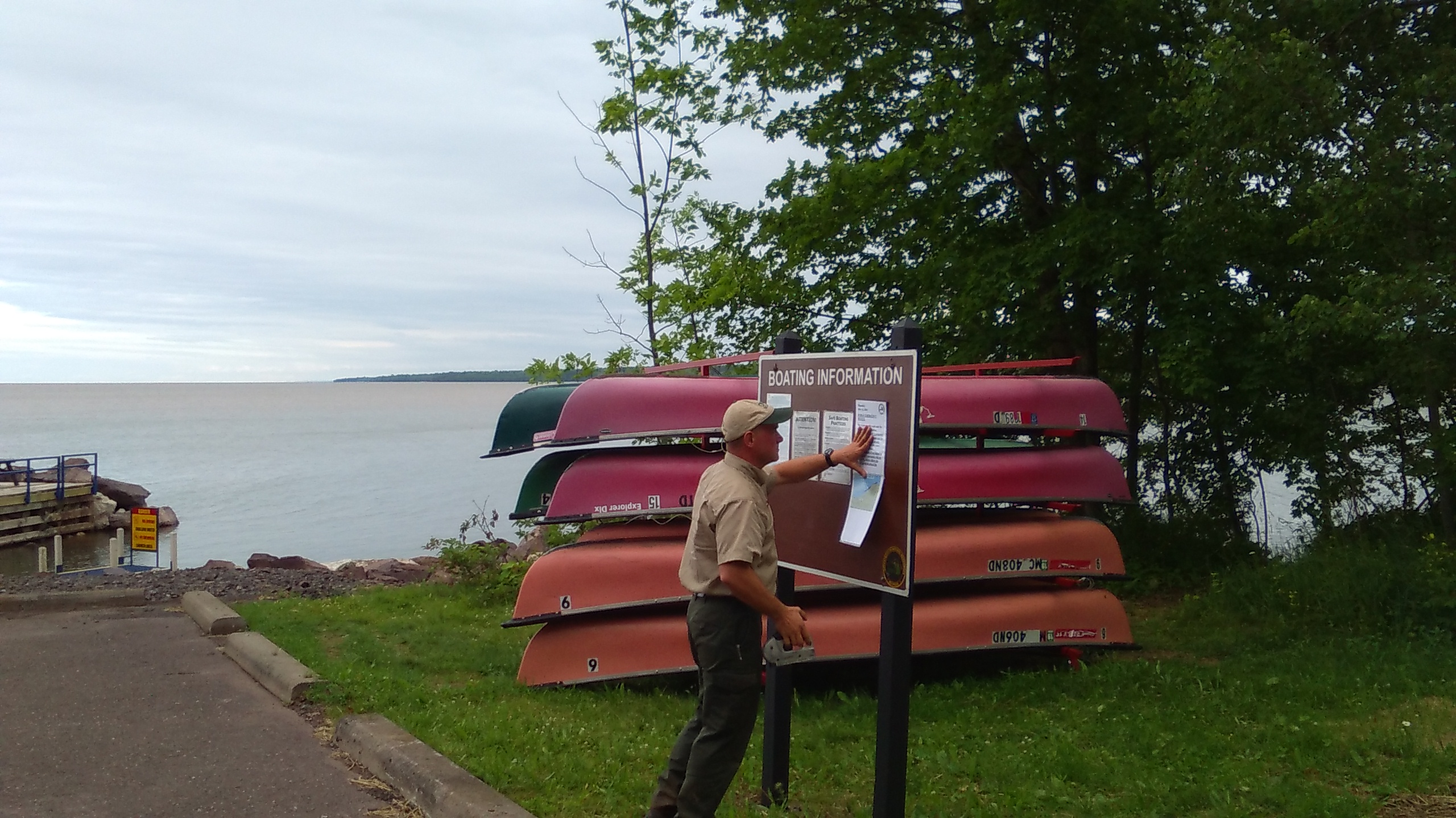 Signs: Bob Wild, a park interpreter at Porcupine Mountains Wilderness State Park, posts a public emergency notice today cautioning boaters against a floating debris field expected to reach the park shoreline tonight.