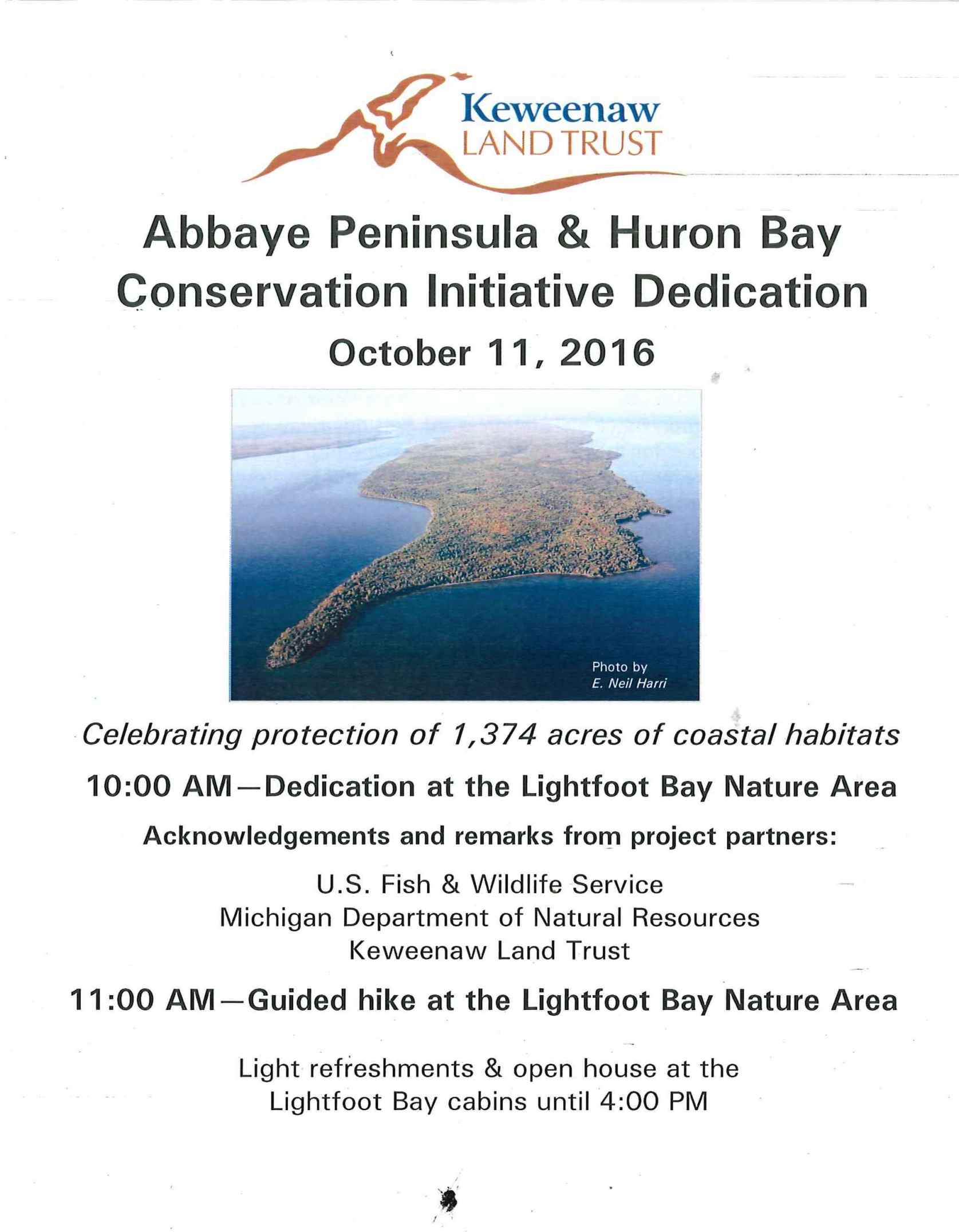 The Keweenaw Land Trust (KLT), U.S. Fish and Wildlife Service (USFWS) and the Michigan Department of Natural Resources (DNR) welcomed the public to a dedication ceremony today for lands acquired as part of the Abbaye Peninsula – Huron Bay Conservation Initiative in Michigan’s Upper Peninsula.