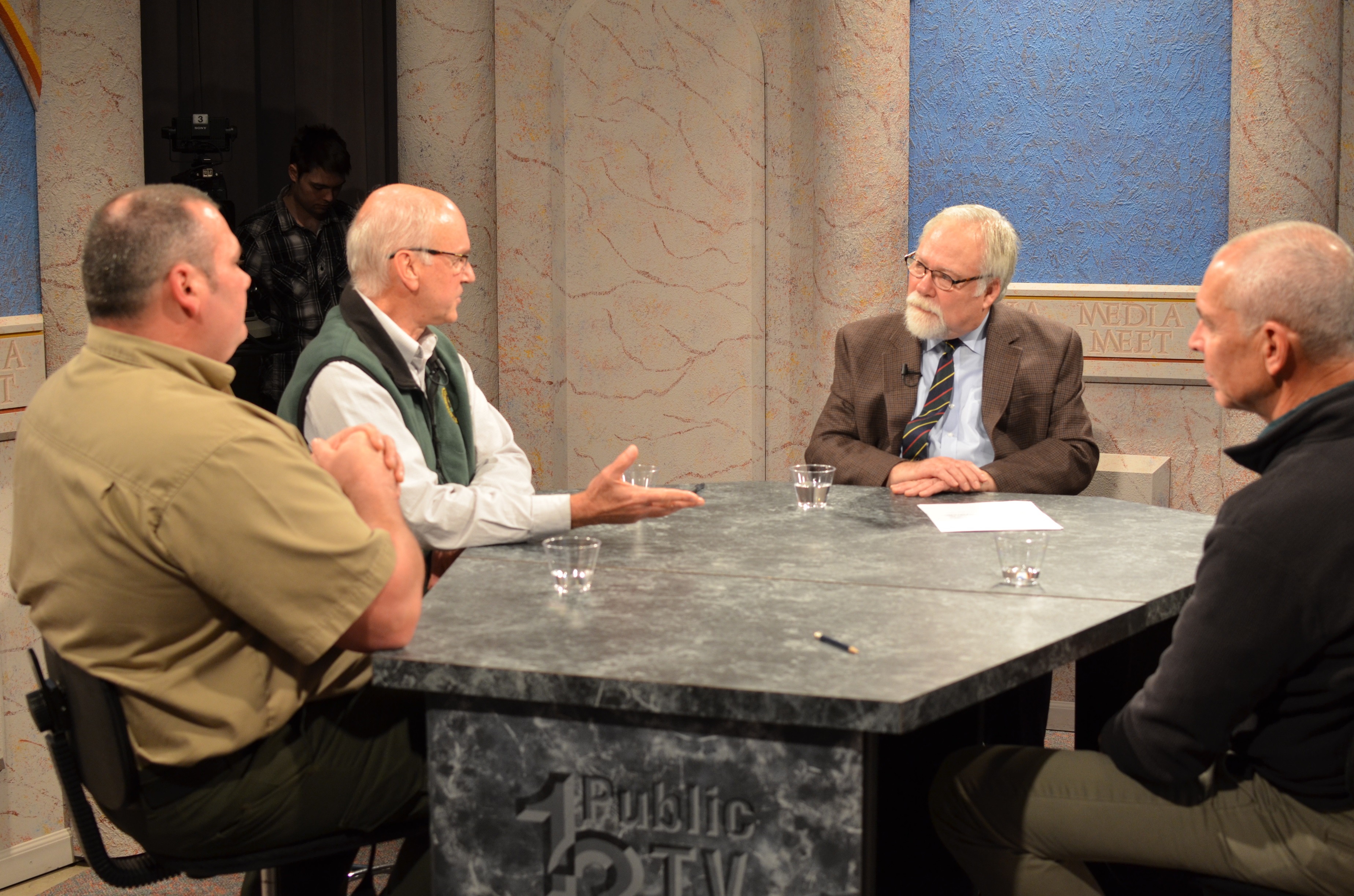 Panel: Bob Heyd, DNR Forest Health Management Program leader, second from left, makes a point in a discussion with Media Meet host Bill Hart. Listening and looking on is Roger Mech, DNR Forest Health Monitoring Program leader, right, and James Peace, lead ranger at Lake Gogebic State Park, left./