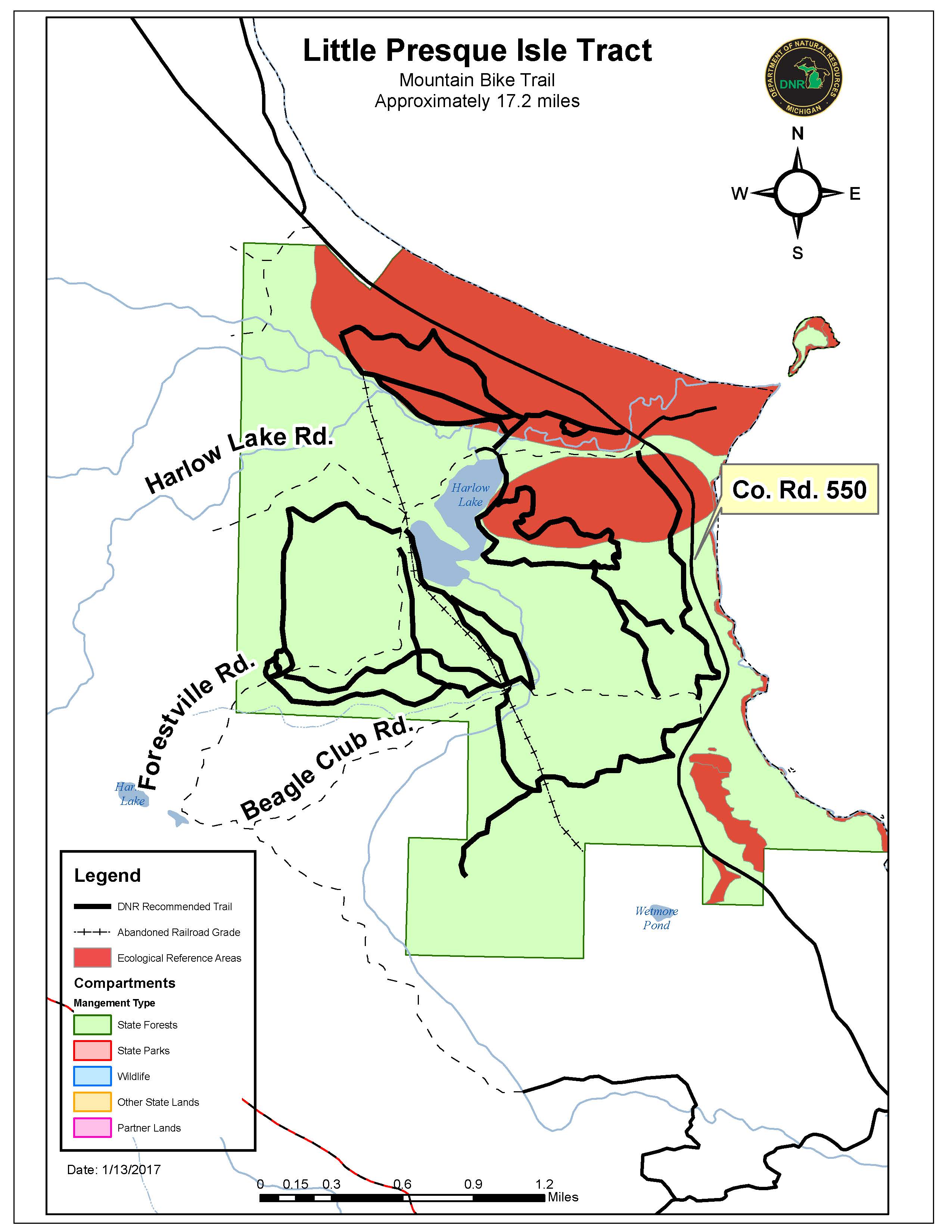 In May 2015, the Friends of Harlow submitted a trails proposal to the DNR, seeking designation of 19.7 miles of non-motorized, multi-use trails at Little Presque Isle.