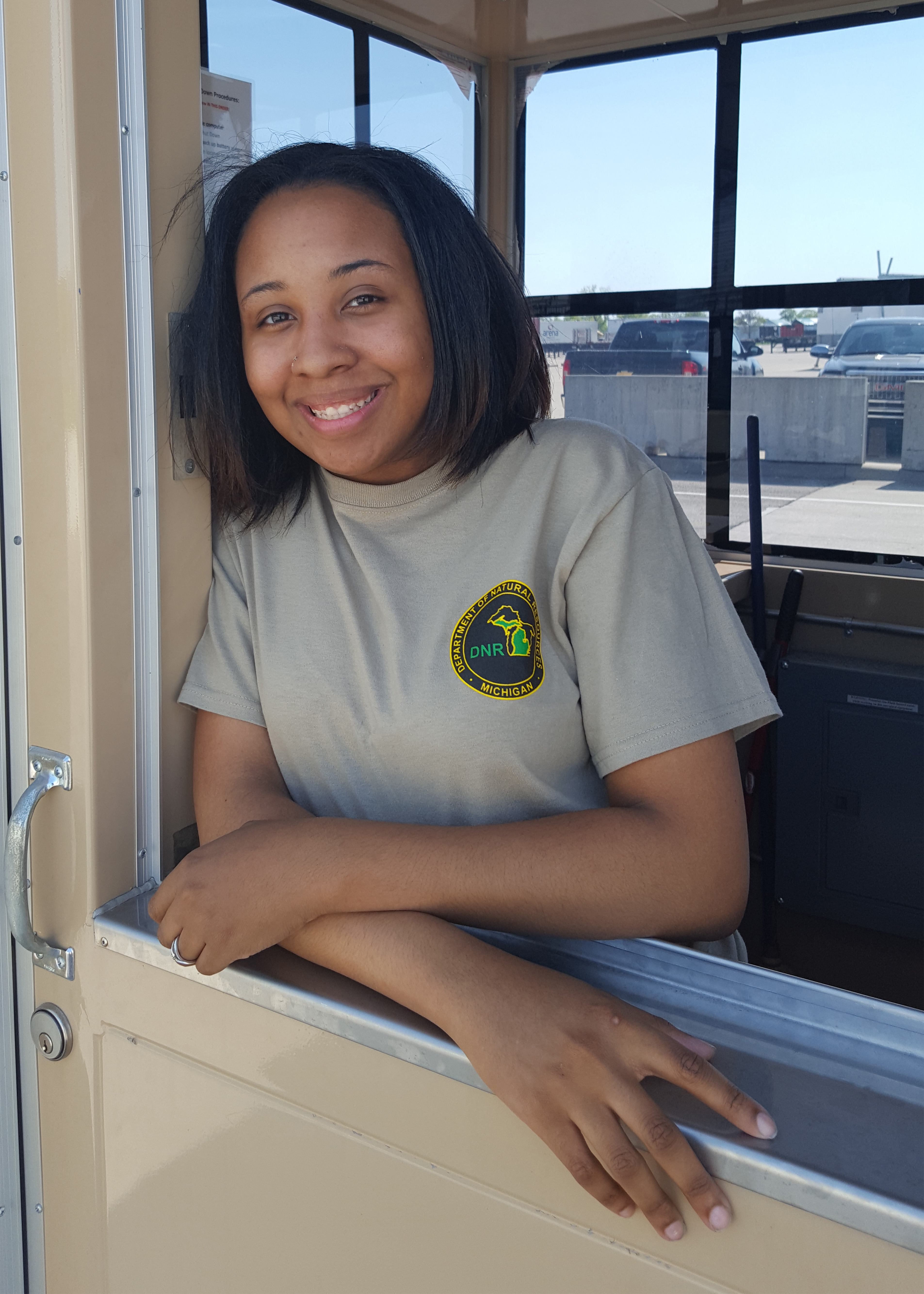 The Michigan DNR now is hiring summer seasonal workers at Belle Isle Park and Milliken State Park and Harbor in downtown Detroit. Pictured here is Amyra Williams, who for three years now has worked summers at the Belle Isle entry booth, greeting customers and starting their visit off with a smile./