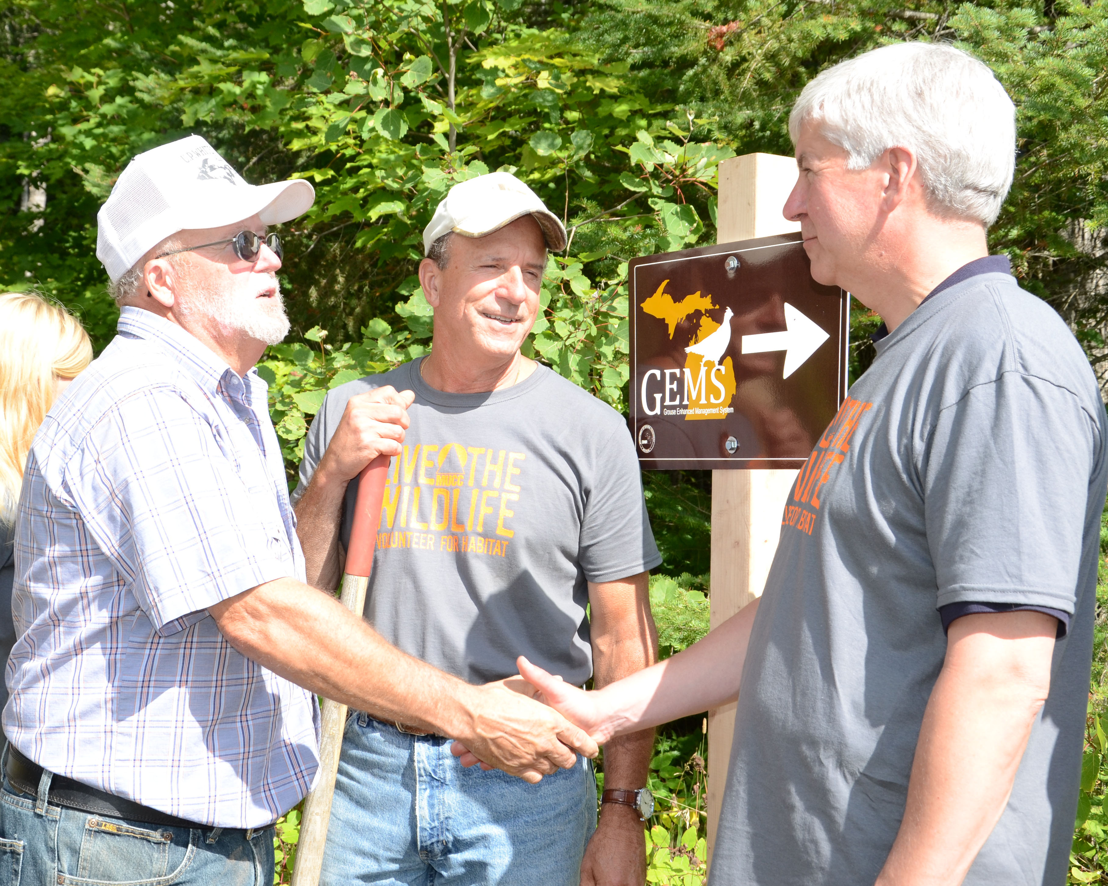 Governor: Alan Ettenhofer, left, shakes hands with Gov. Rick Snyder at a tree-planting event at the South Marquette County Grouse Enhanced Management Site in August 2014. Also pictured, center, Gildo Tori, director of public policy for Ducks Unlimited./