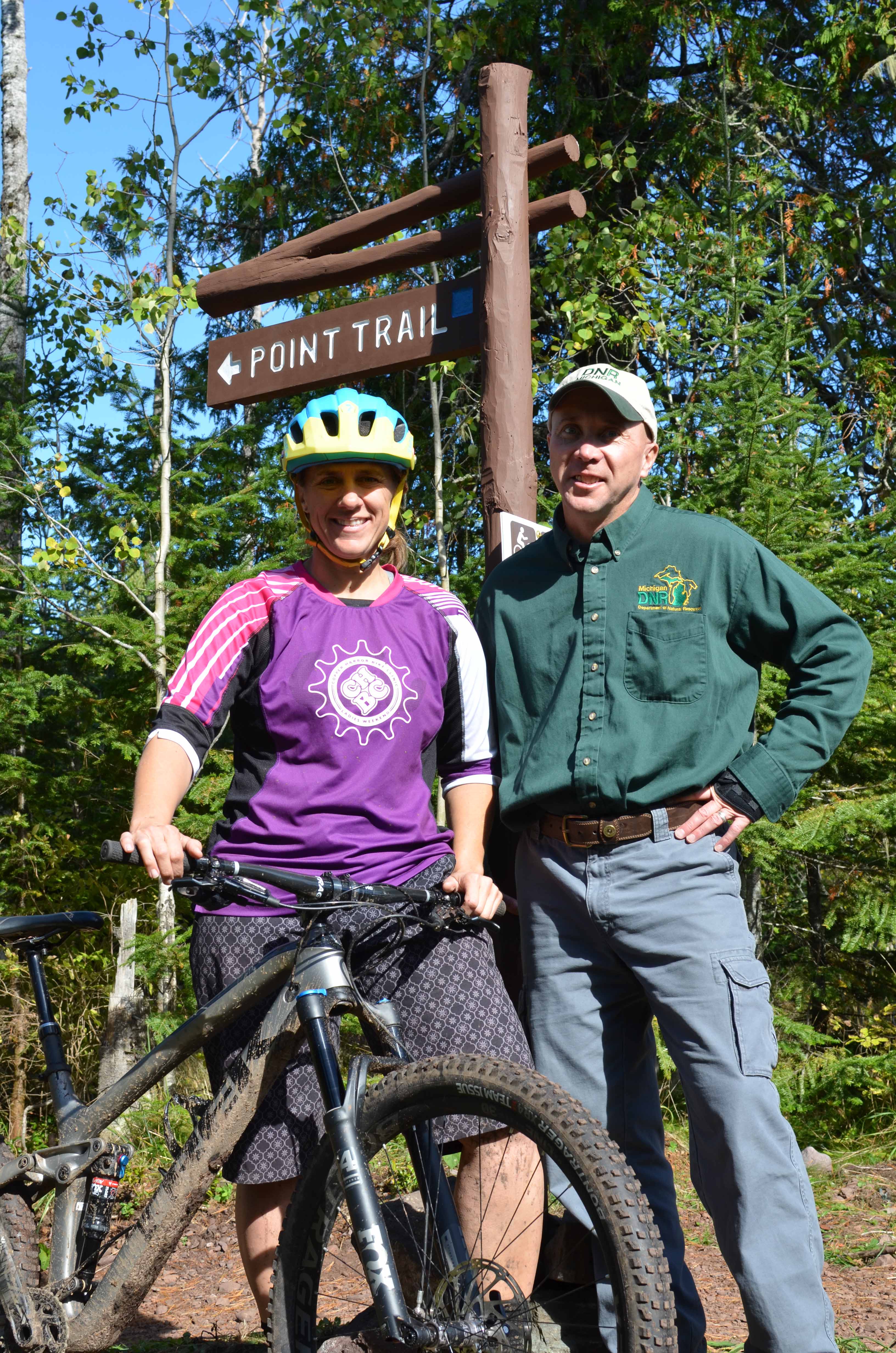 Partners: Lori Hauswirth, executive director of the Copper Harbor Trail Club, and Michigan Department of Natural Resources Upper Peninsula trails coordinator Ron Yesney pose for a photo Thursday along the Keweenaw Point Trail at High Rock Bay./