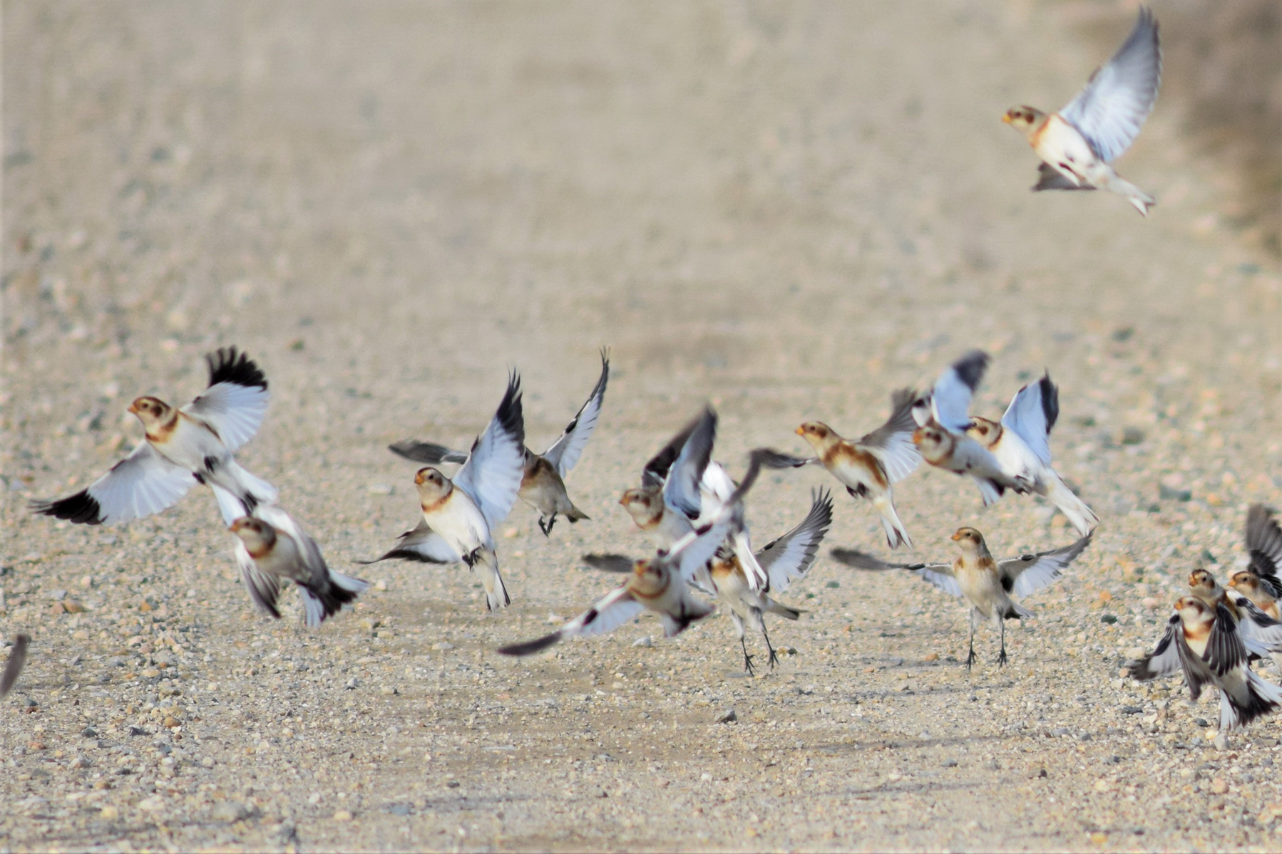 group of snow buntings lifting off ground in flightSmall songbirds called snow buntings come to Michigan from their breeding grounds in the Arctic to spend the winter feeding on small grains and seeds in grasslands and fields. Their graceful flight and white plumage has earned them the nickname “snowflakes.”