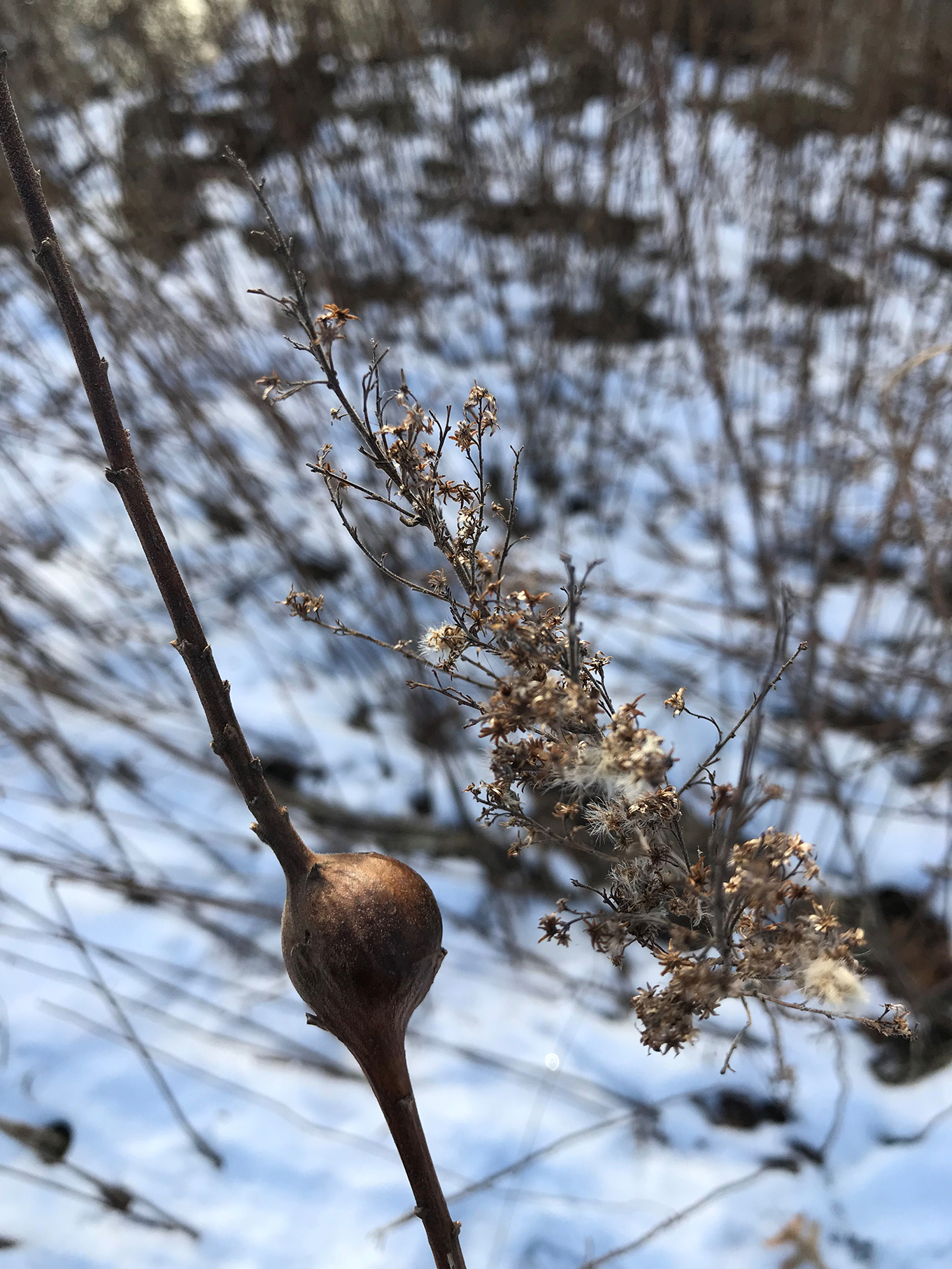 Goldenrod gall: Goldenrod gall flies live in these round balls, called galls, in the summer and fall as larva and then pupate in the winter. When spring rolls around, the adults fly out of the gall and start a new generation of flies.