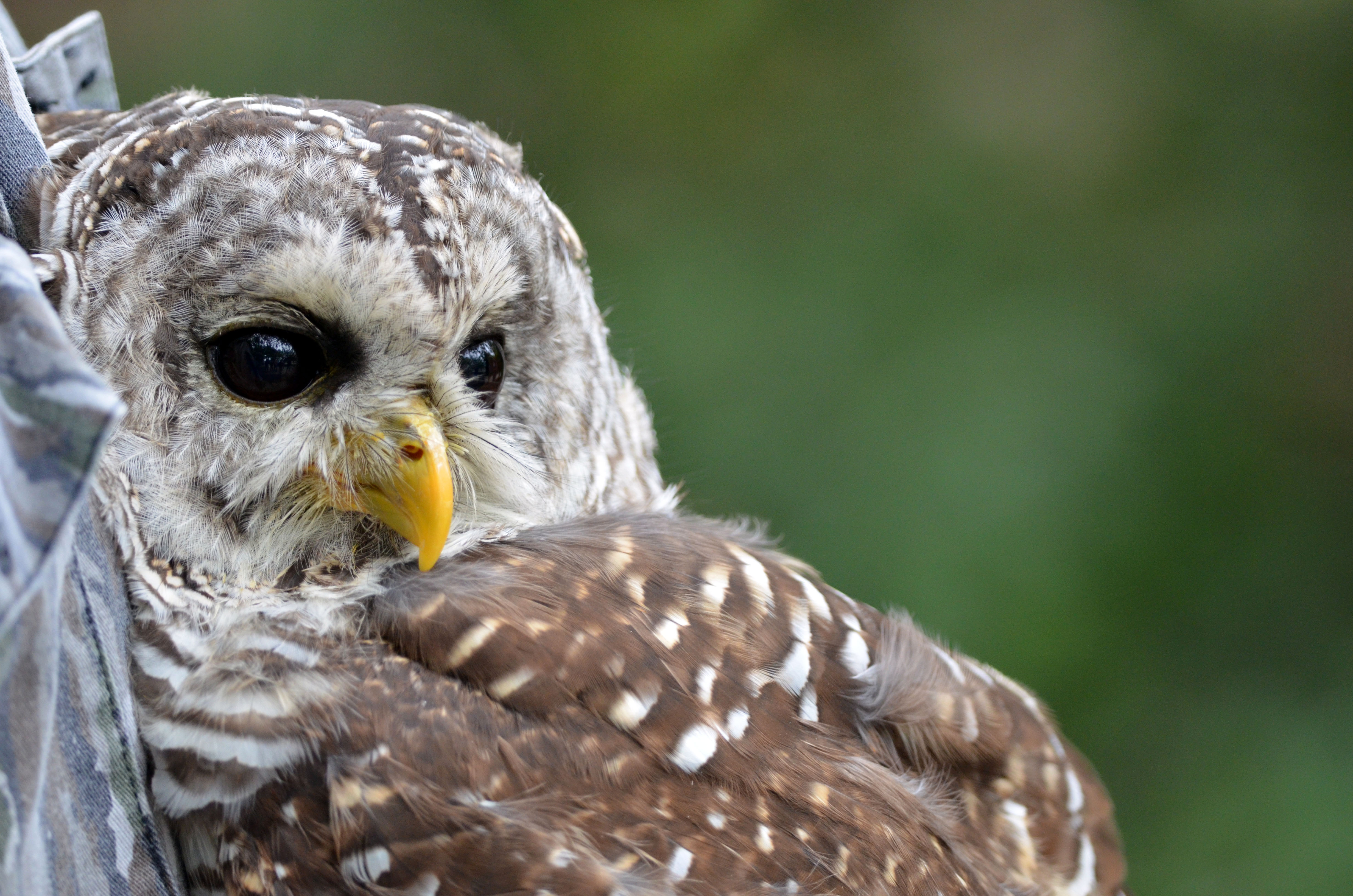 A wildlife assistant holds a barred owl, which is identified by its round head and dark eyes.