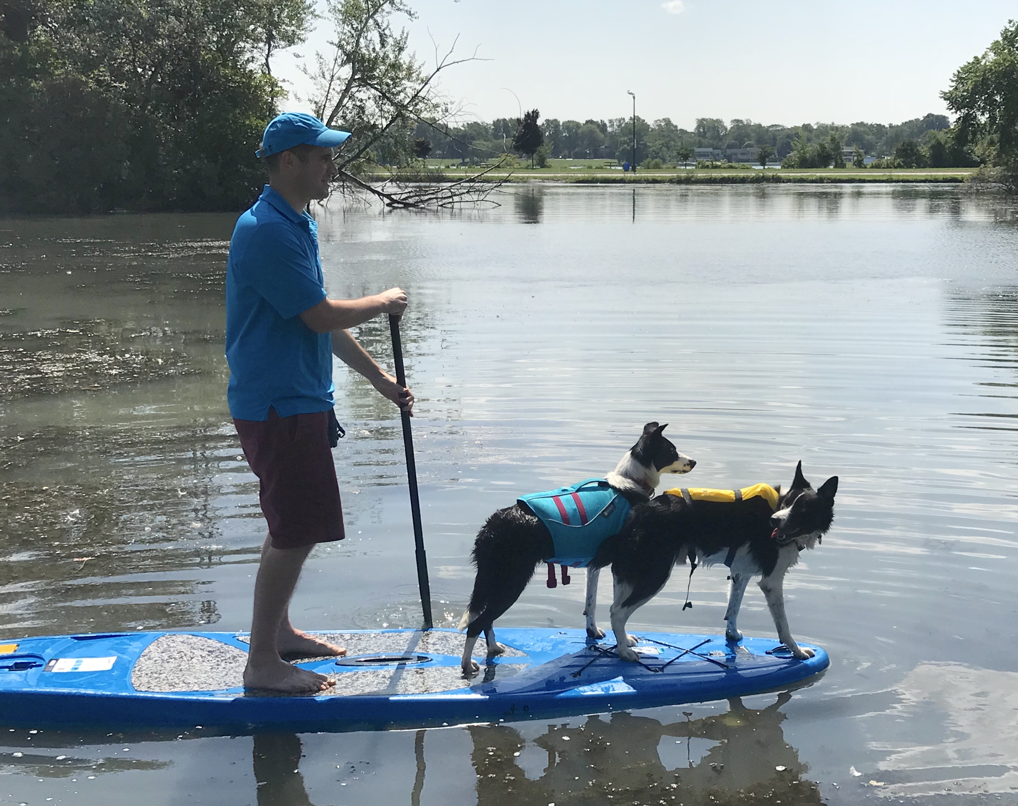 Border collies on paddle board: Border collies from Detroit-based Goodbye Geese help to scare geese from the water and land at Belle Isle.