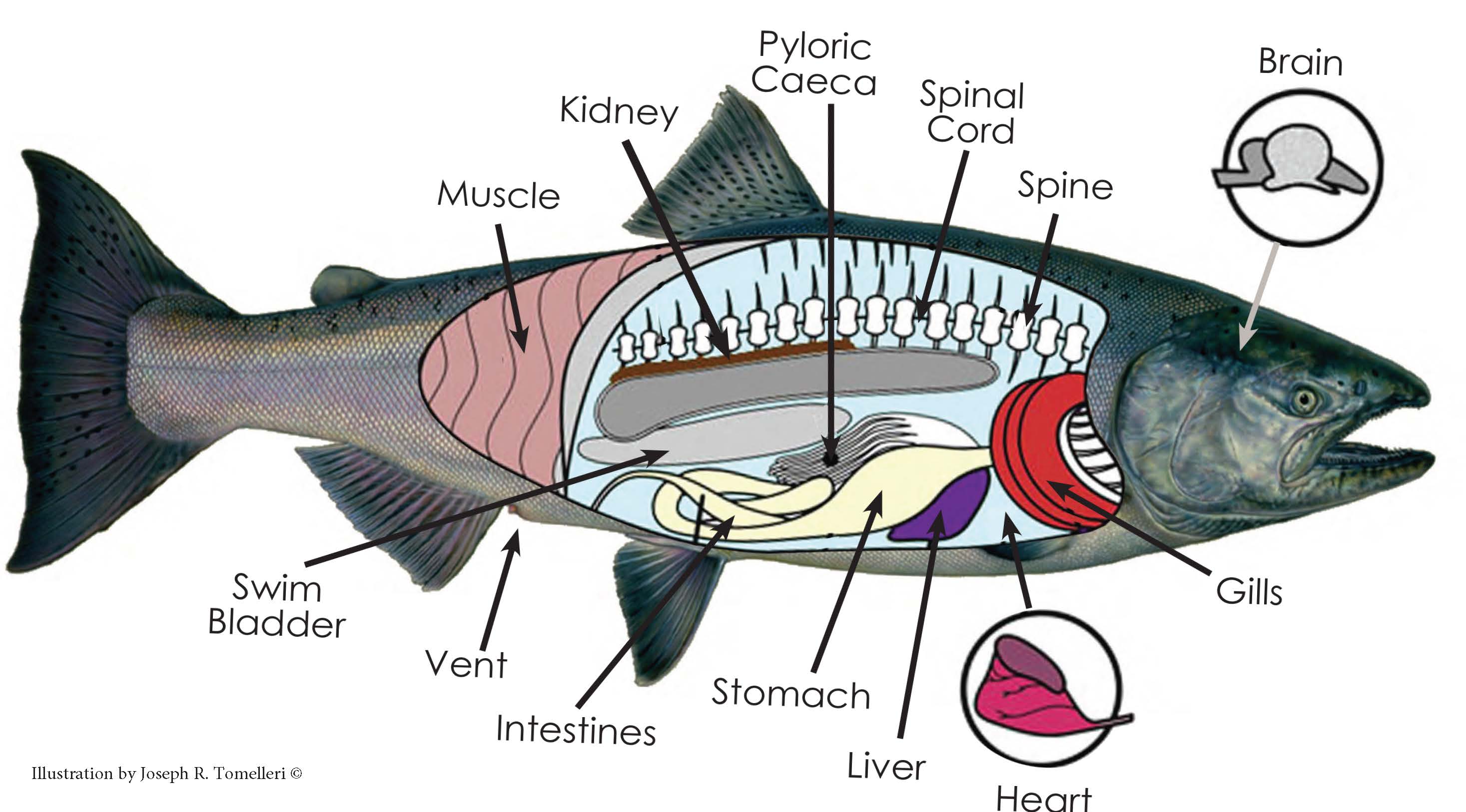 Each species of fish that you might catch may have slightly different anatomy (the organs and bones inside). But fish have similar organs to you and me! You will find their heart, brain, liver and stomach. But you will also find some specific fish organs like gills, swim bladders, scales and more!