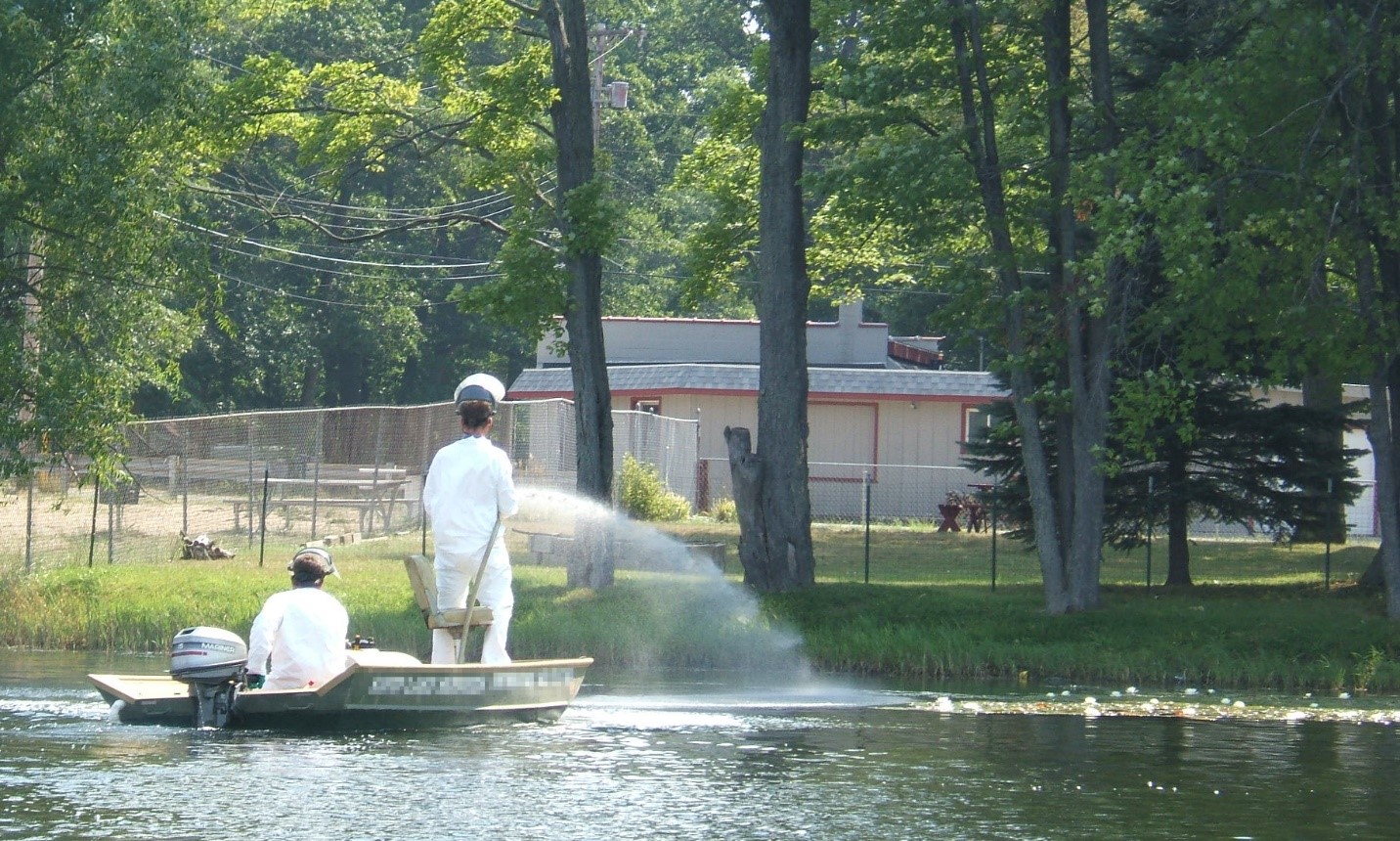 Treatment: Chemical treatment of aquatic invasive plants often requires a permit from the Department of Environment, Great Lakes, and Energy. Pictured is the chemical treatment of aquatic invasive plants by licensed aquatic herbicide applicators. /