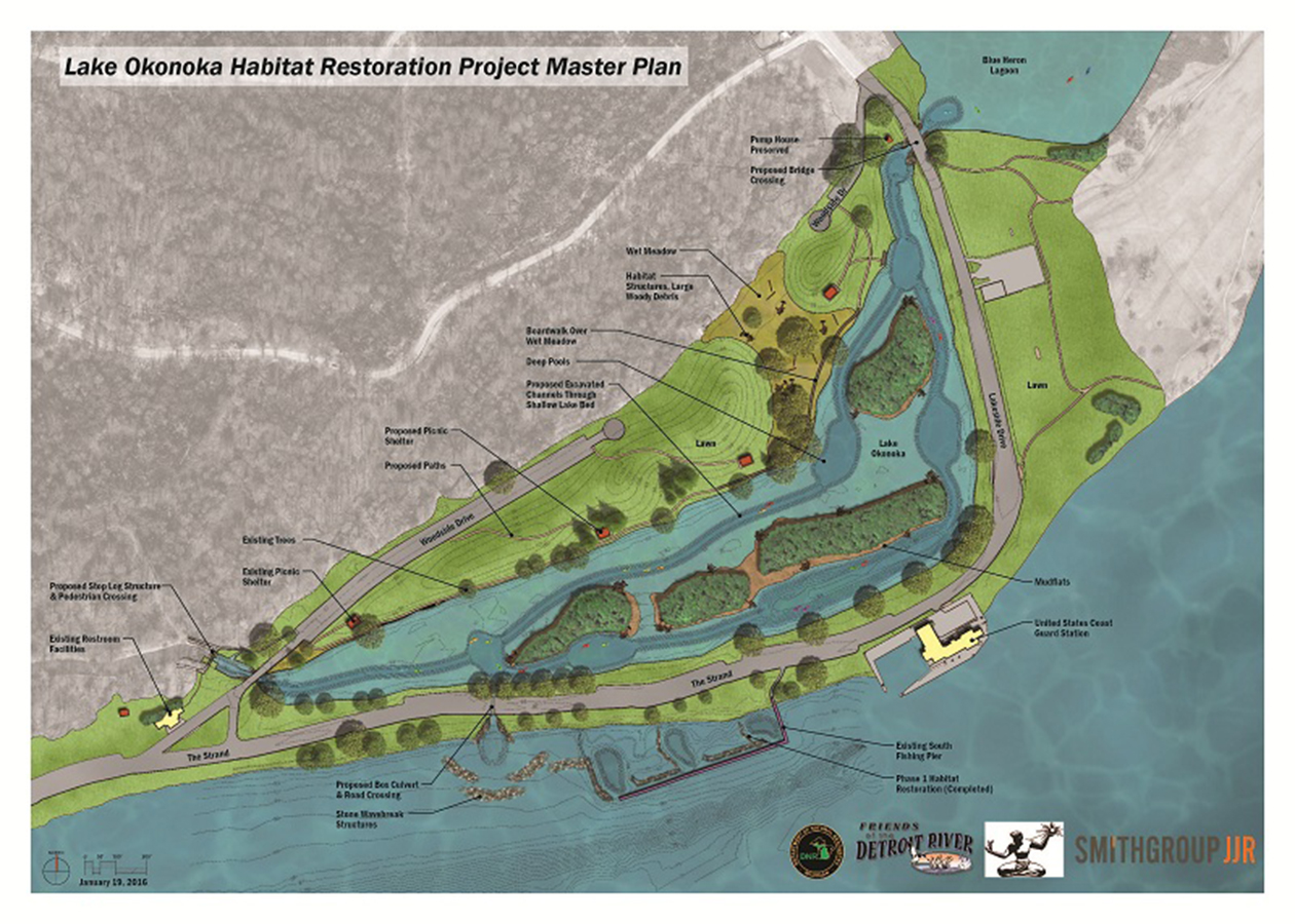The Detroit River Public Advisory Council includes the Friends of the Detroit River; Department of Natural Resources; Department of Environment, Great Lakes, and Energy; Michigan Sea Grant; U.S. Environmental Protection Agency; the City of Detroit and others. The Lake Okonoka project is one of 14 projects targeted for completion as part of the Detroit River Area of Concern delisting process. Of the 14 targeted projects, eight are completed. The projects are funded largely by the Great Lakes Restoration Initiative.