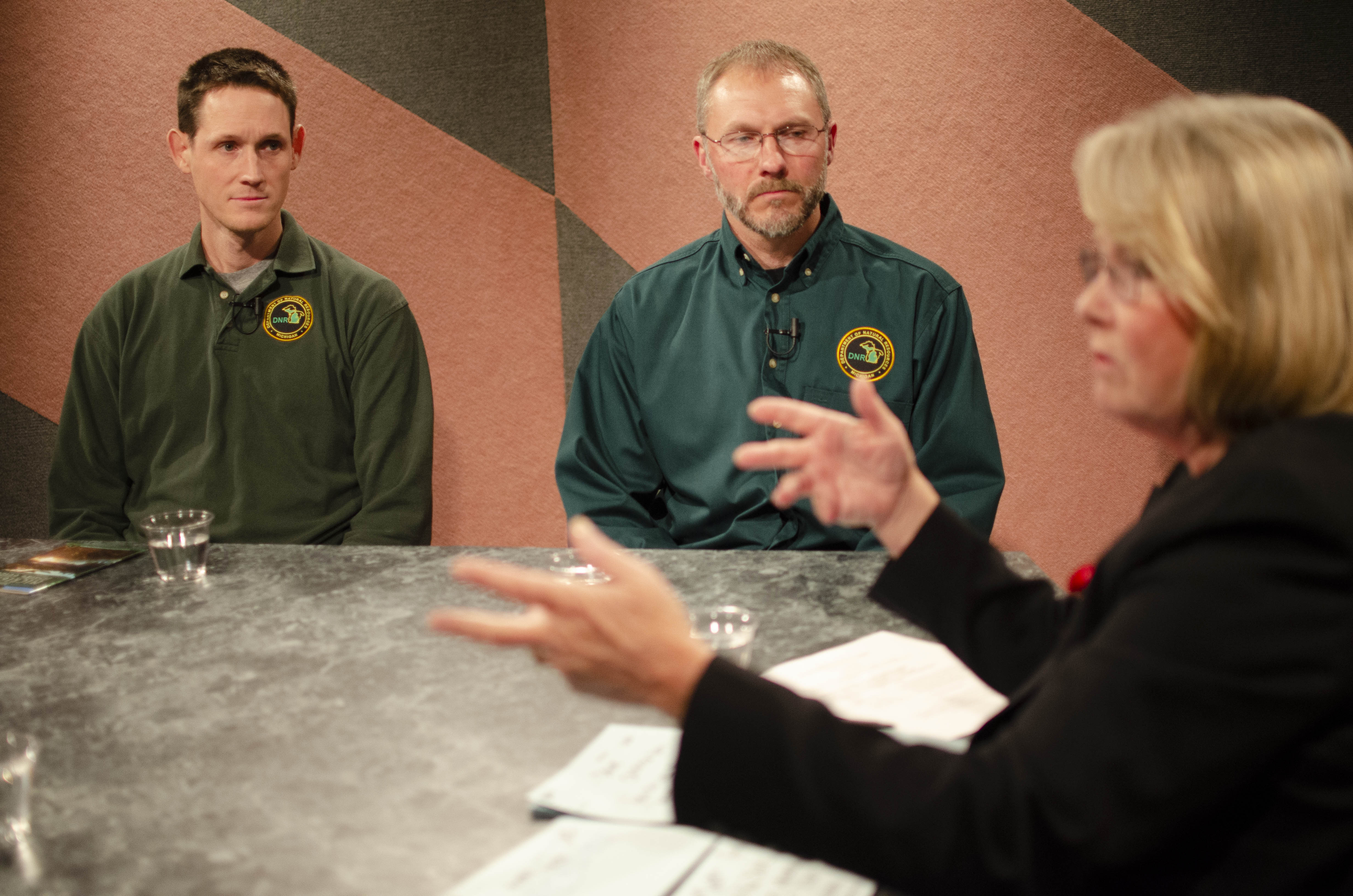 Host: “Ask the DNR” host Ann Feldhauser waits to hear the answer to a question during a broadcast. Looking on are DNR fisheries biologist John Bauman, left, and DNR wildlife biologist Dave Jentoft.